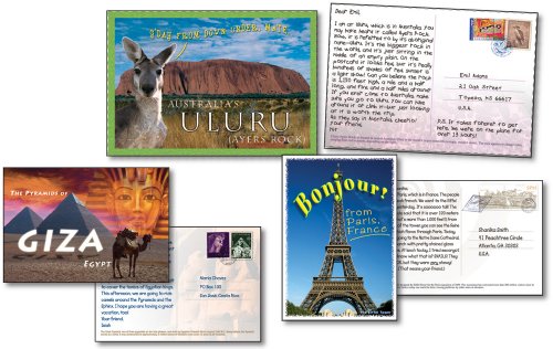 -. Feature : 12 postcard fronts showing famous landmarks or locations / 12 postcard backs containing messages describing the locations or landmarks / Supports National Geography standards
