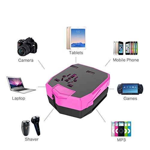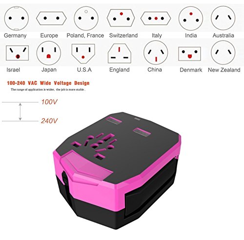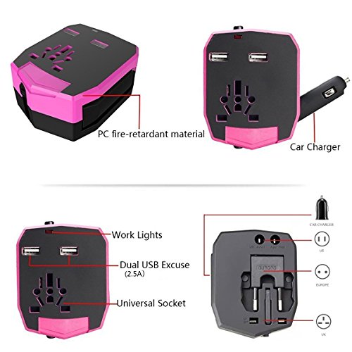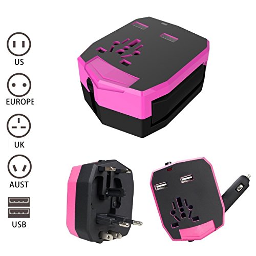 Worldwide Power Adapter Plug (Europe/US//UK/AU), KINDEN International Universal Travel Wall Charger Dual USB Car Charger AC Socket (Rose red)