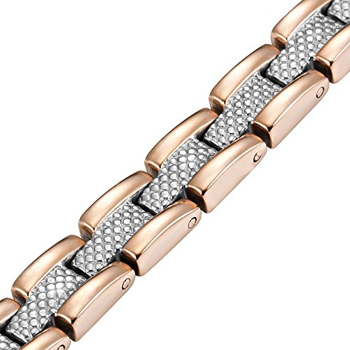 Studio : Willis Judd Publisher : Willis Judd Binding : Jewelry Product Description Blending elegance with strength, this super lightweight two tone rose gold titanium bracelet from our latest collection will make the perfect gift for that special person in your life. Weighing in at just 15 grams, it is made from finest quality Titanium, which feels so light you'll hardly know you are wearing it! 190mm long and approx. 7mm wide, it comes packed in an impressive bracelet box at no extra cost. Also included in the price is an easy-to-use Link Removal tool, allowing you effortlessly to adjust the bracelet to your requirements from the convenience of your own home. What's more, we have a no-quibble, money-back return policy. Hypoallergenic, this bracelet will not irritate skin. However, as with any jewellery which uses magnets, it is not suitable for pacemaker users. Willis Judd is proud to be selling this delightful bracelet on Amazon - please read feedback from our satisfied customers. 0