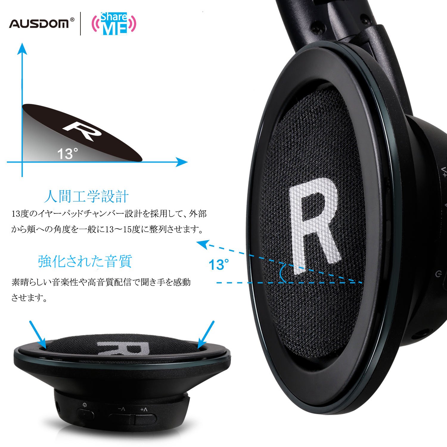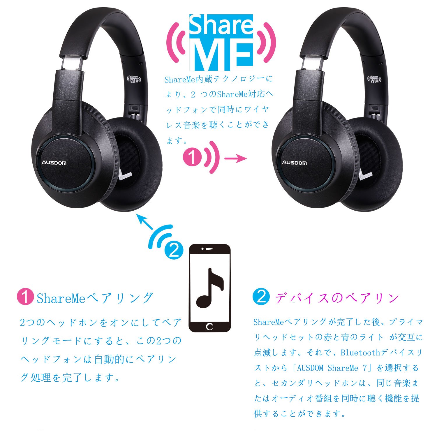 With ShareMe built-in technology, you can listen to wireless music simultaneously with two ShareMe compatible headphones.