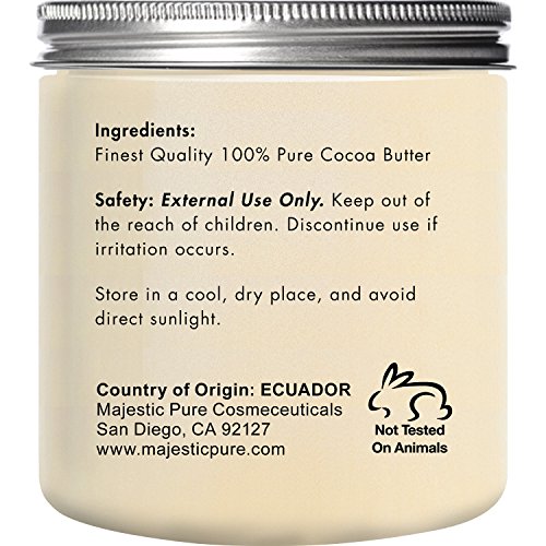 Cocoa butter is widely noted to help fade scars and reduce stretch marks. There are many other great benefits of cocoa butter you might not know about. It can help moisturize your skin, manage your hair, and it's an excellent source of antioxidants which help combat free radicals and help save your skin from the inevitable signs of aging and environmental stressors. Cocoa butter boasts numerous benefits. It has a set of regenerative qualities and provides you natural beauty. Moreover, it has a "majestic" scent of cocoa!