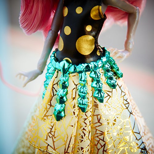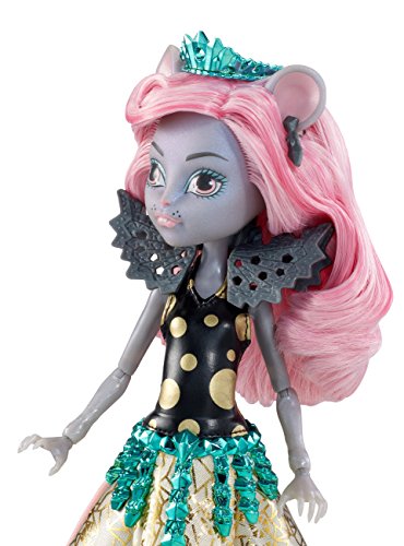 With the promise of extra-bright lights in the big city, the Monster High ghouls are heading to Boo York City in their first musical, Monster High Boo York, Boo York! There, they hope to witness the historic passing of the Crystal Comet at a hair-raising gala and monster skull-ebration. Their adventures introduce them to new beast friends carving their way in the big city: Luna Mothews, daughter of the Moth Man; Mouscedes King, daughter of the Rat King; and Elle Eedee, daughter of The Robots. Each wears her fiercest fashion and out-of-this-world accessories for the gala event that will skull-ebrate the comet’s passing. More princess than pest, Mouscedes King doll avoids looking cheesy with Upper Beast Side style. Her gore-geous gown shines with golden polka dots on the collared bodice and a gold foil tapered skirt. A bright belt and matching tiara are a-mazing, and her mouse ears, tail and tufted fur are totally monsterrific! Use the doll stand and doll hairbrush to style the gore-geous dolls and capture a flawesome moment. Plus, a diary with character info adds to the fun. For a full cast of ghoulish characters, collect all of the Monster High Boo York dolls (sold separately)! Includes Mouscedes King doll wearing fashion and accessories, a doll stand, doll hairbrush and diary with character info. Doll cannot stand alone. Colors and decorations may vary.Feature