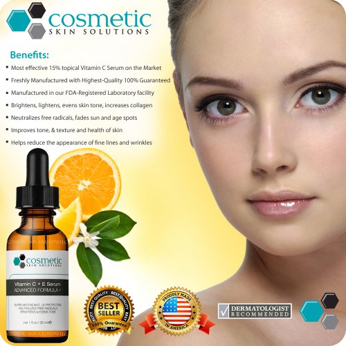 - Feature : All Cosmetic Skin Solutions products' are Manufactured in our FDA-Registered laboratory facility under strict US FDA guidelines. Made in the USA. No Parabens. No Oils. Cruelty-Free. / This Best Selling topical antioxidant Vitamin C+E Serum is the highest-quality Vitamin C Serum available in today's cosmetic marketplace. / This Best Selling Vitamin C Serum uses Cutting-edge technology combining 0.5% Ferulic acid (potent antioxidant found in cell walls of plants) with 15% pure L-Ascorbic acid (Vitamin C), and 1% Alpha Tocopherol (Vitamin E) giving it advanced antioxidant performance. / This Vitamin C Serum stimulates collagen production and neutralizes free radicals. / The manufacturing date and time a product is applied are both critical components which define the performance level a topical antioxidant treatment will provide to the skin. Cosmetic Skin Solutions LLC manufactures our entire line of topical antioxidant treatments once per week to ensure absolute freshness and to optimize efficacy prior to use.