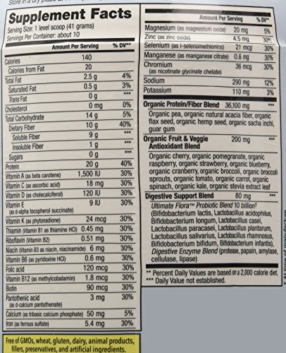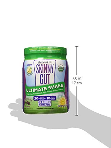 skinny Gut Ultimate Shake is organic, grain free,plant based and high in protein and fiber. You get 20 grams of protein, 10 grams of fiber and 10 billion live Ultimate Flora probiotics in every serving.