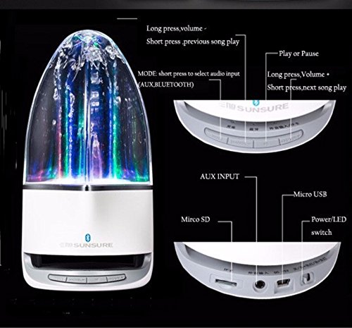 Feature : fountain bluetooth speakers / Use Home Theatre,Portable Audio Player,Mobile Phone,Computer / Music Fountain design,Tracking the music beats to bounce / Bluetooth to connect smart phone/ computer low consumption,Charging 4-6 Hours can use 6 hours / Compatible different product,Smart phones, Laptops, PC, MP3, MP4