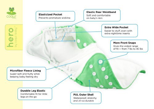 -. Feature : • The Hero is named after the Hero's Journey, the transformation every woman makes to become Mother and Child. At Coquí we celebrate families and are passionate about adding joy to parenting. We back our products with the Coquí Baby® Scout's Honor 30-day Money Back Guarantee and 12-month Bumper-to-Bumper Product Replacement. / • Comparable quality to diapers costing twice the P.R.Ice, the Hero is unbeatable value. It is known for its super-soft, stay-dry fluffy inner liner, making Baby the most comfortable they can be. It is made with 5% Active Wick Athletic-Grade fleece, so the Hero gives your little athlete the performance and fluff they need and love, long after the soft lining of other brands has eroded away. / • The Hero is incredibly trim and well-fitting across an industry-leading range of 7 to 40+ lbs. This provides you and your baby with a true, more comfortable birth-to-potty diaper. / • Outer PUL lining breathes while waterproofs. Soft elasticized pocket opening is placed in back below the leading edge so soakers don't escape and cause premature wicking. Pocket opening makes for easy custom-stuffing for mix n' match ease! Two microfiber inserts included: 1 rectangular (15.75 x 5.25 inches); 1 hourglass shape (12 x 5.25 inches). The Hero is 100% polyester. / •All materials that go into the Hero are all certificated by GOTS with Oeko-Tex Standard 100 to ensure no harmful dyeing agents are used. The fabric manufacturing process has been lab-tested by Intertek. The Hero is also available in MINKY!