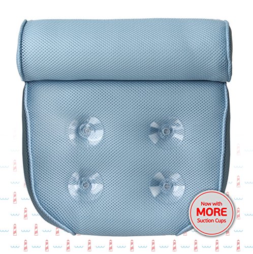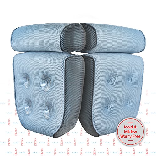 SUPER SOFT FOR ADDED COMFORT AND STAYS IN PLACE » Only high quality materials have been used to create this tub pillow. No rubbers, no plastic, just QUALITY SUPER SOFT FIBERS that feel comfortable to the skin for a smoother, more relaxing bath. And, unlike other pillows, no need to worry about it popping or a nasty plastic smell. Also, we promise it will stay in place with its 4 heavy duty suction cups, instead of it floating around in your bath.