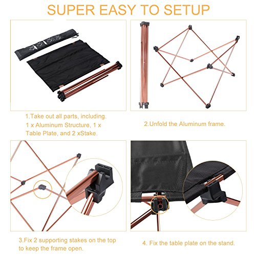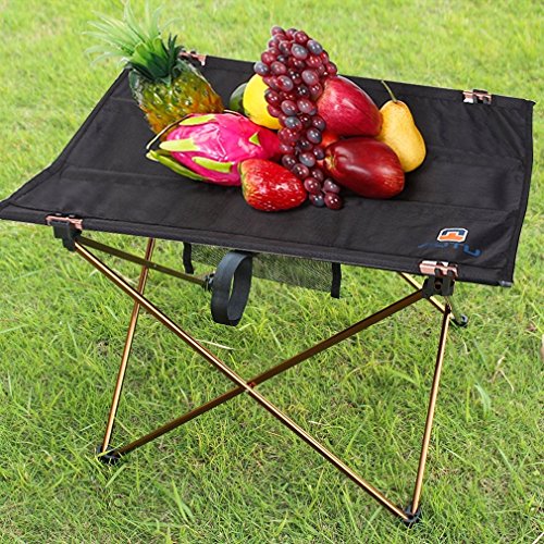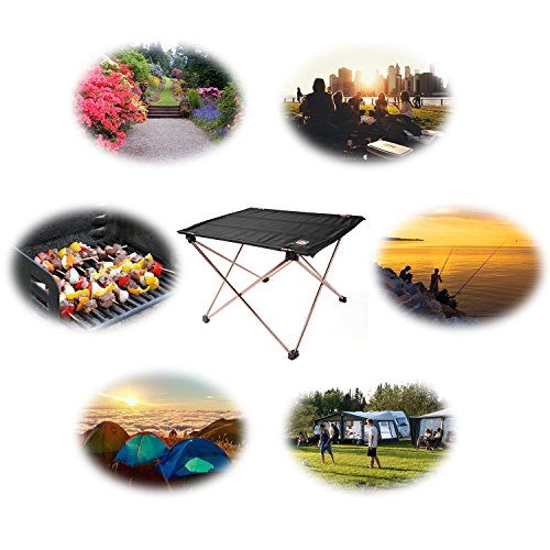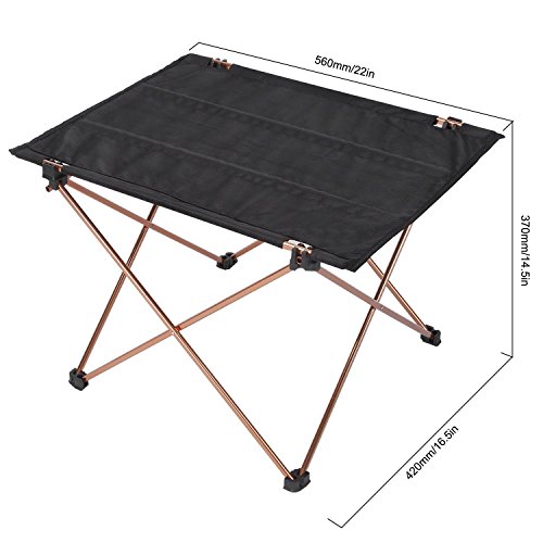 Product DescriptionSpecifications: Color: Black Frame material: 7075 aluminum alloy Table top material: oxford nylon fabric Dimensions: Unfolded 22 x 16.5 x 14.6 inches, Folded 22 x 2.4 x 2.4 inches. Weight: 1.5 pounds Package included: 1 x Carry bag 1 x foldable table0