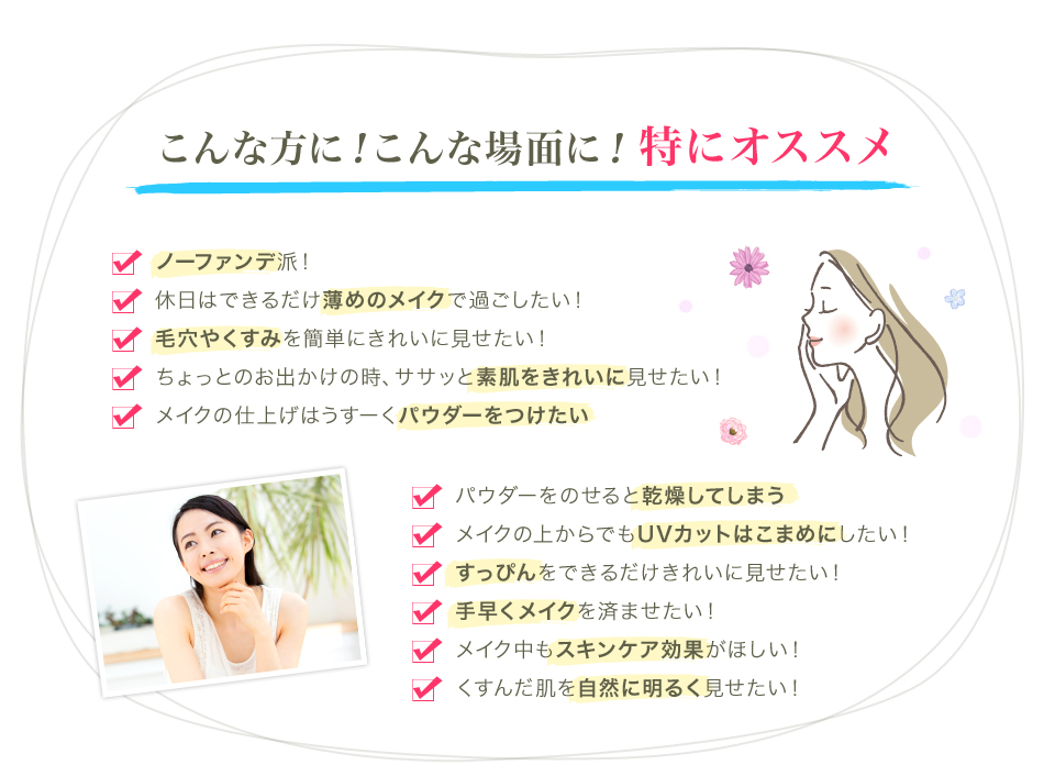 | ご使用上のご注意 | 1.お肌に異常が生じていないかよく注意して使用してください。 化粧品がお肌に合わないとき、すなわち次のような場合には使用を中止してください。 そのまま使用をつづけますと、症状を悪化させることがありますので、皮膚科専門医等にご相談されることをおすすめします。 ●使用中、赤み・はれ・かゆみ・刺激・色抜け(白斑等)や黒ずみ等の異常があらわれた場合。 ●使用したお肌に直射日光が当たって上記のような異常があらわれた場合。 2.傷やはれもの、湿疹等異常のある部位にはお使いにならないでください。 |