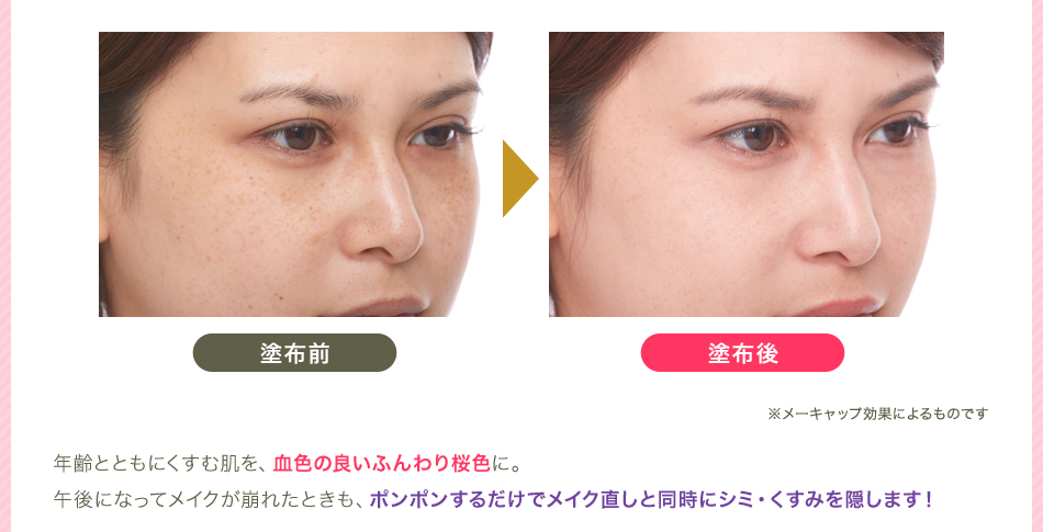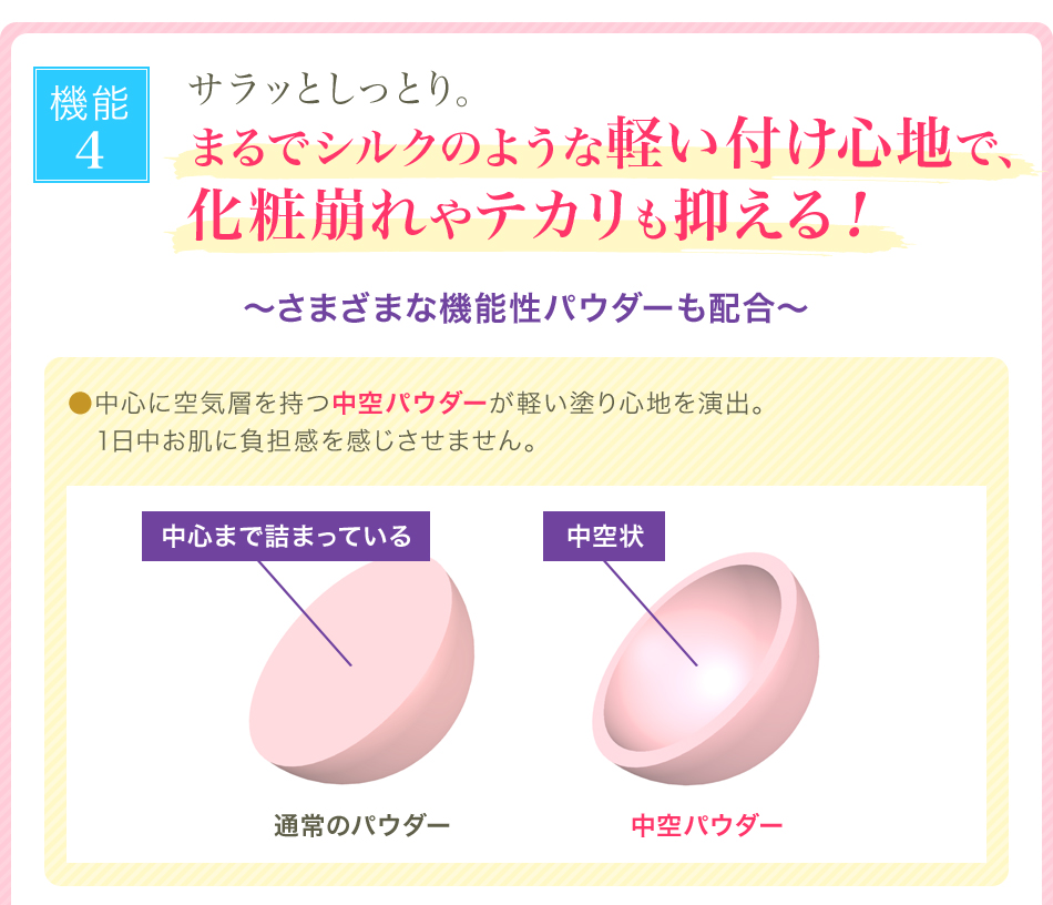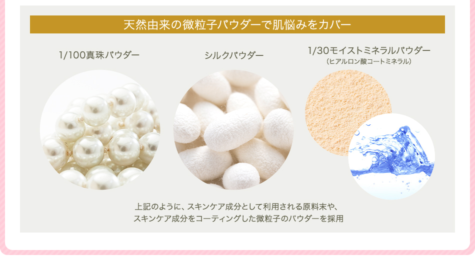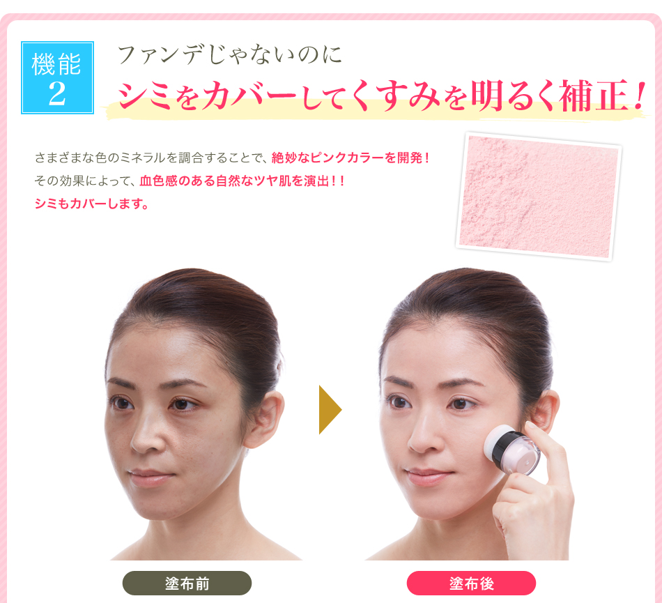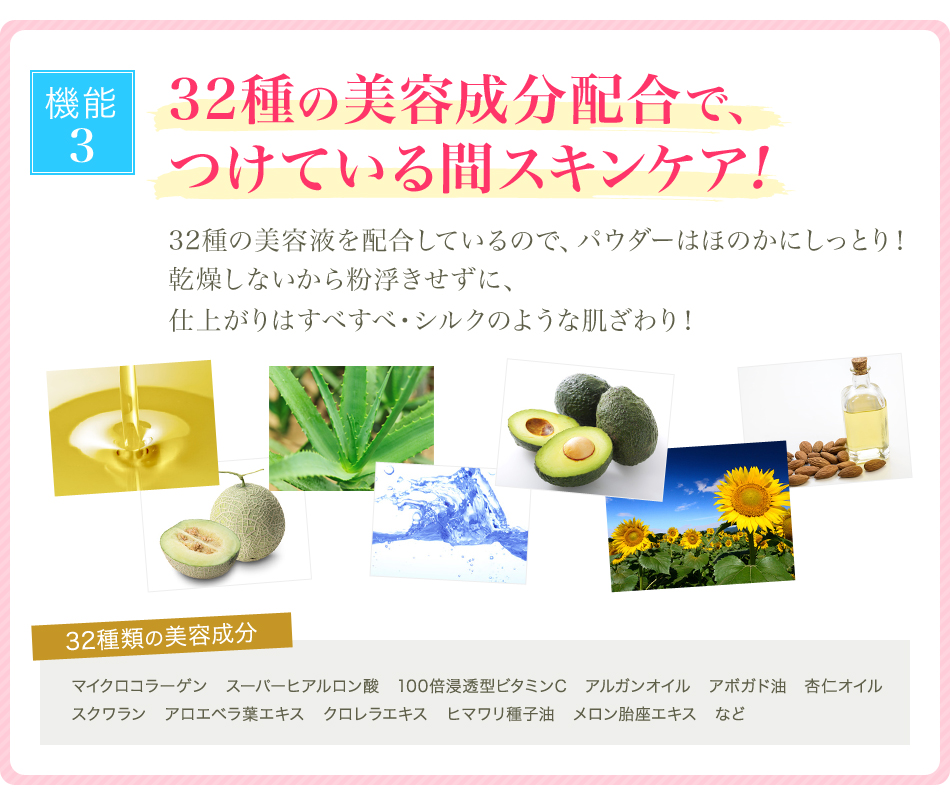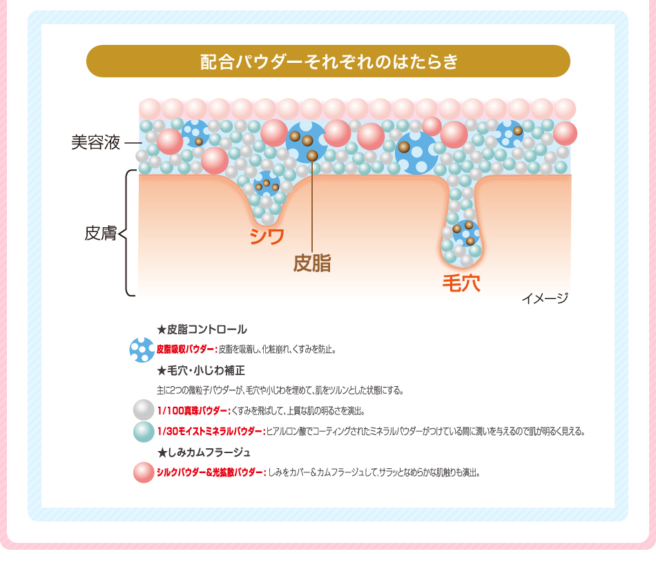 | 成分 | 合成金雲母,シリカ,酸化チタン,酸化亜鉛,水酸化Al,ステアリン酸,加水分解コラーゲン,ヒアルロン酸Na,加水分解ヒアルロン酸 アセチルヒアルロン酸Na,テトラヘキシルデカン酸アスコルビル,パルミチン酸アスコルビルリン酸3Na,アルガニアスピノサ核油 シルク,パール,,スクワラン,アボカド油,プルーン種子エキス,アンズ核油,加水分解コメヌカエキス,アーチチョーク葉エキス メロン胎座エキス,ノイバラ果実エキス,エブリコエキス,トマト果実/葉/茎エキス,レモン果実エキス,クズ根エキス,セージ葉エキス ローズマリー葉エキス,アロエベラ葉エキス,クロレラエキス,セイヨウアカマツ球果エキス,スギナエキス,ホップエキス,ヒマワリ種子油 ゴボウ根エキス,サボンソウエキス,セイヨウキズタ葉/茎エキス,オランダガラシエキス,パルミチン酸エチルヘキシル,ラウロイルリシン (ジメチコン/ビニルジメチコン)クロスポリマー,エチルヘキシルグリセリン,カプリル酸グリセリル,ハイドロゲンジメチコン 水,BG,酸化ジルコニウム,AMP,アルミナ,含水シリカ,ジメチルシリル化シリカ,酸化スズ,ペンチレングリコール,タルク,酸化鉄 |