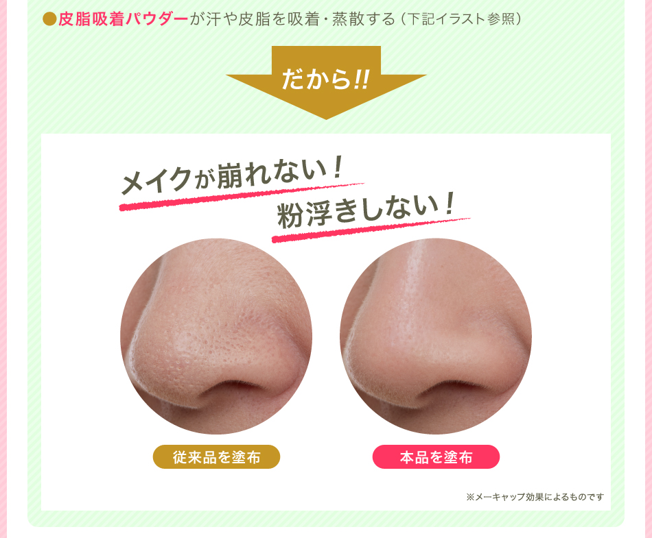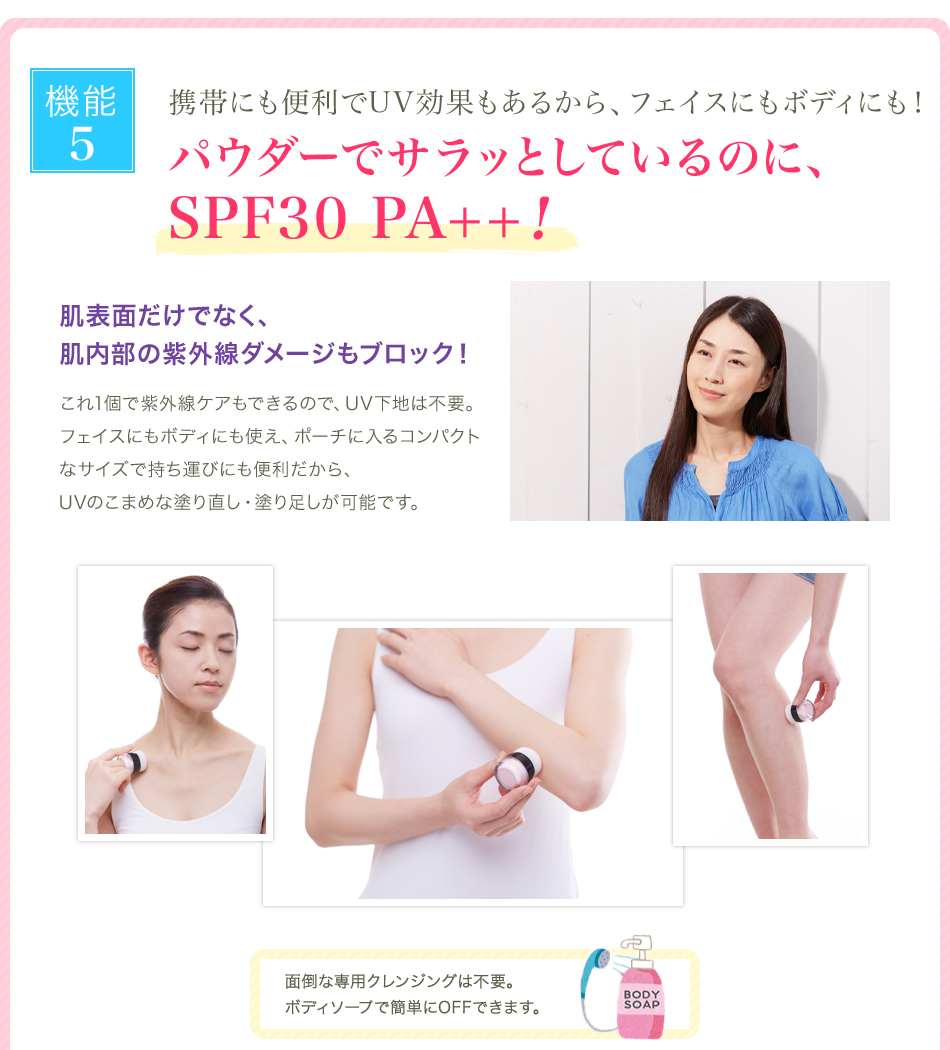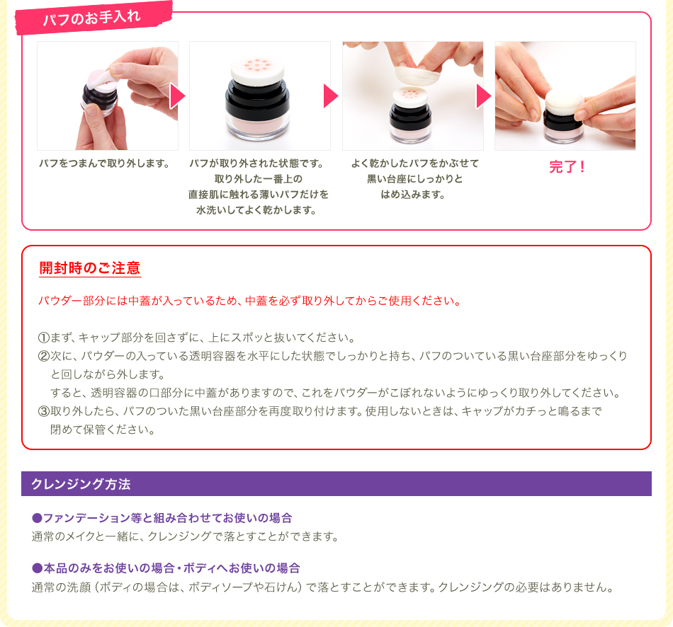 | ご使用方法 | 【開封時】 まずパフの付いたキャップを回しながら取り、中ブタを外してください。 その後、パフの付いたキャップを閉めてください。※中ブタを外す際に、パウダーが飛び散ることがありますのでご注意ください。 パフをポンポンたたくと、パウダーが出てきます。手の甲で付き具合を確認してからご利用ください。 【使用時】 スキンケア後、手の甲で付き具合を確認してから、お肌にポンポンとつけます。 ファンデーションなしでも、ファンデーションの上から仕上げとしてもお使いいただけます。 |