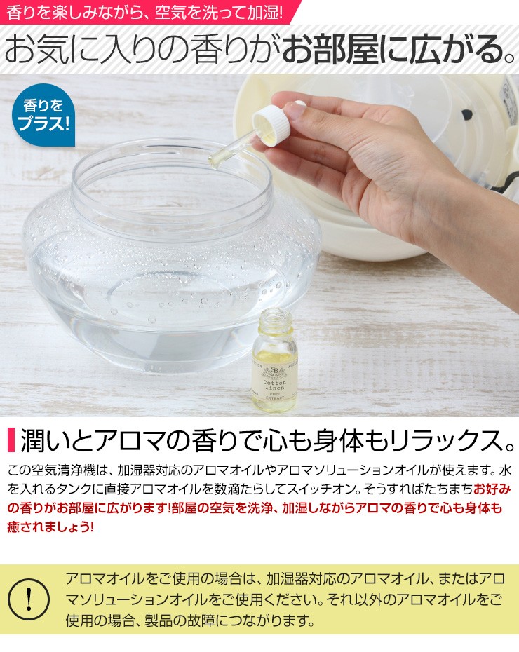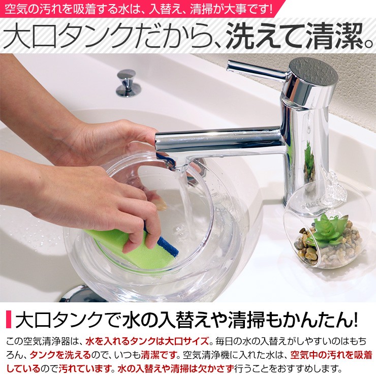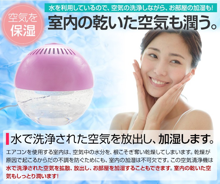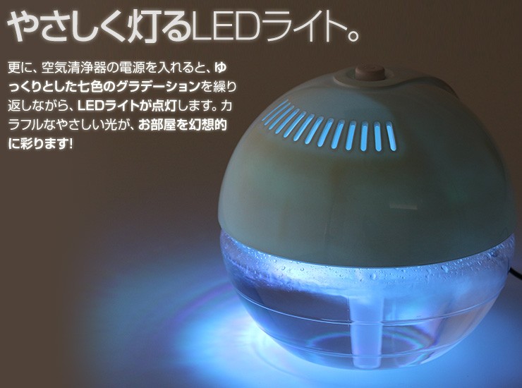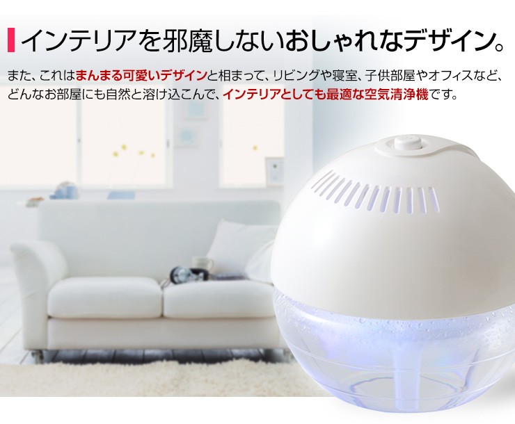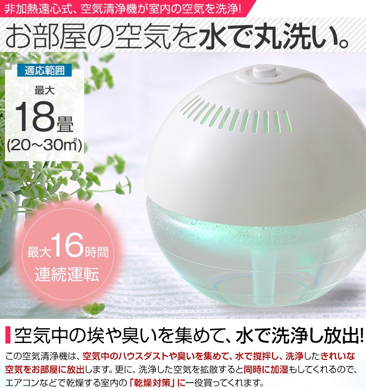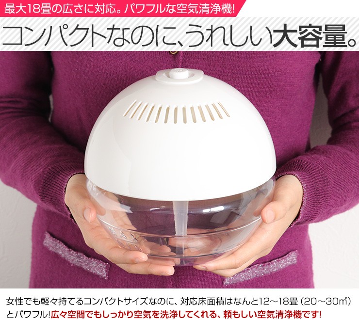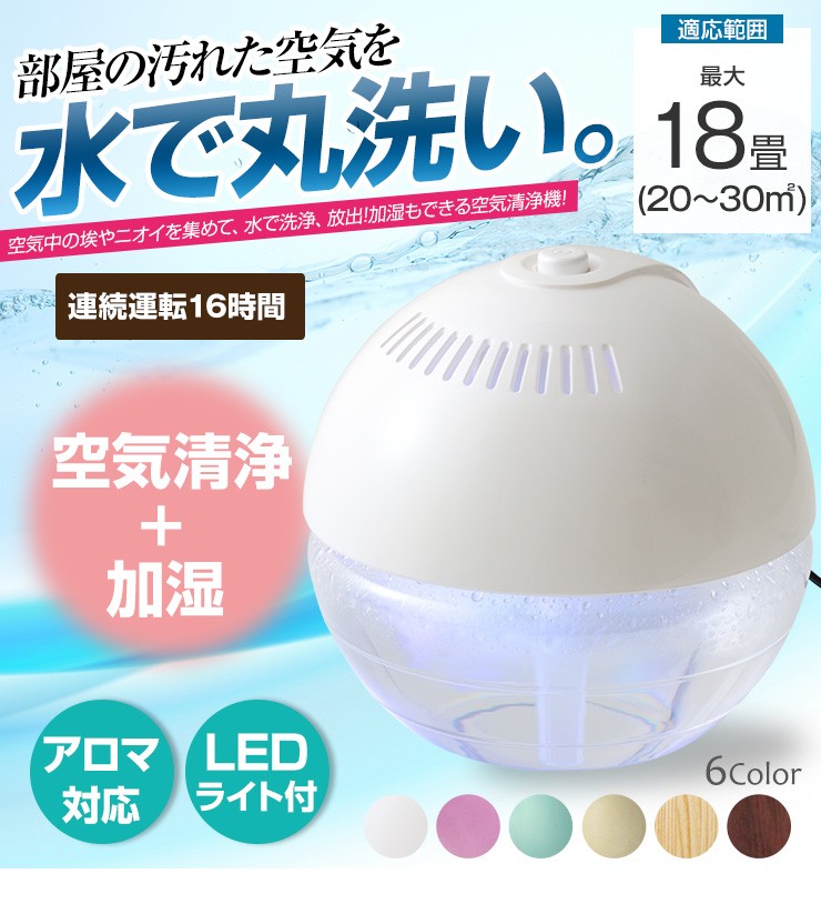 【製品特徴】●水の力で空気をクリーンに!空気中のホコリや臭いを集め、水で洗浄。キレイな空気を放出します。最大18畳の広さまで対応。 リビングや会議室、デスク周り、お子様のいる部屋に最適です。●水を使っているので空気をキレイにしながら、加湿もできます。乾燥対策にもおすすめです。●アロマオイル対応。加湿しながら香りでリラックス。(アロマオイルは別途ご準備ください。アロマオイルをご使用の場合は、加湿器対応のアロマオイル、またはアロマソリューションオイルをご使用ください。)●ころっと丸いデザインは置くだけでお部屋のインテリアに。●LEDライトを搭載。電源を入れると、7色のグラデーションでお部屋を優しく彩ります。●消費電力は10W。1時間当たりの電気代たったの約3円です!お財布にも優しい空気清浄機です。デジキン