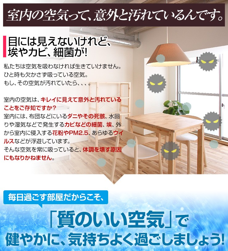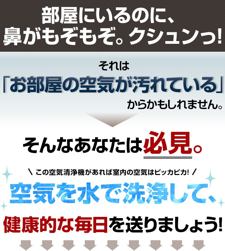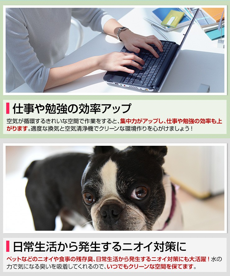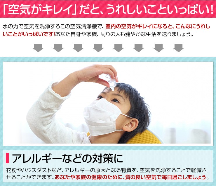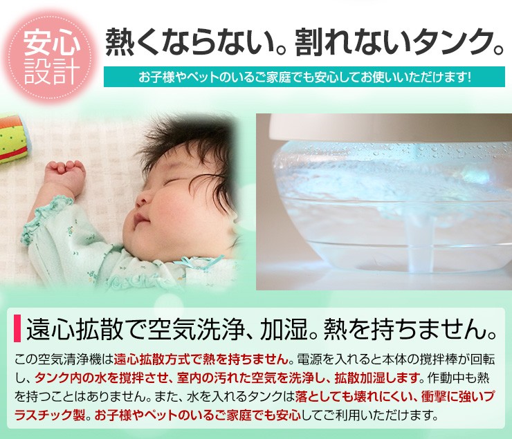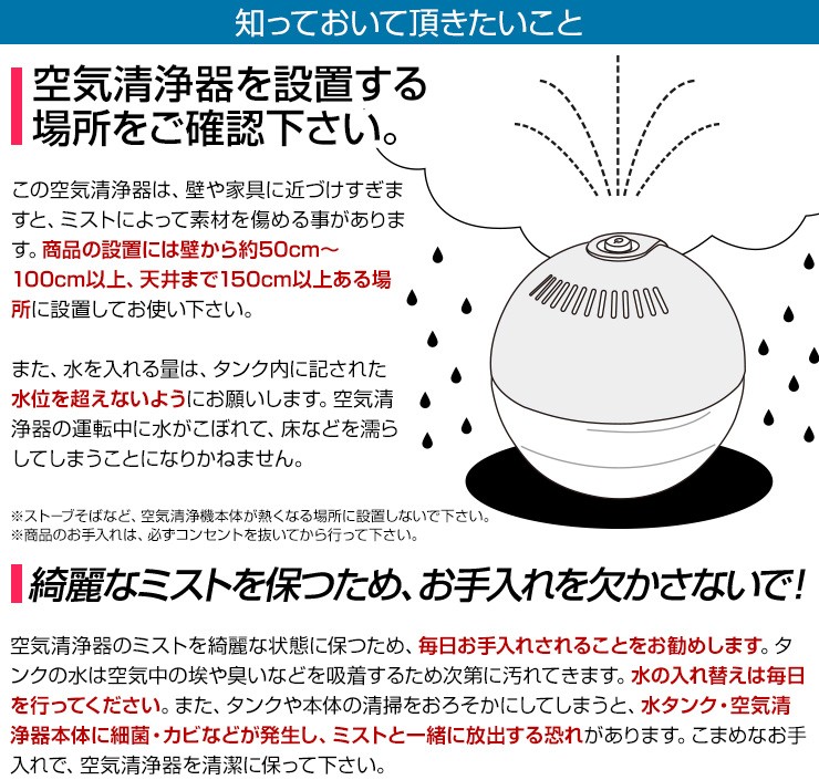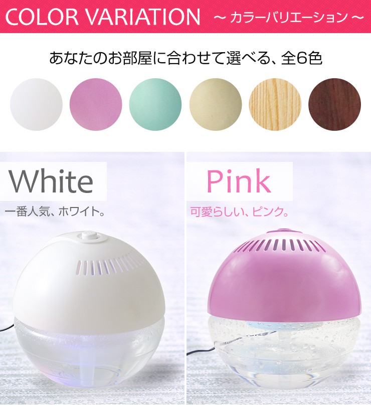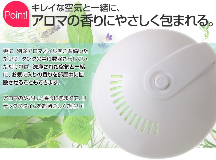 【製品特徴】●水の力で空気をクリーンに!空気中のホコリや臭いを集め、水で洗浄。キレイな空気を放出します。最大18畳の広さまで対応。 リビングや会議室、デスク周り、お子様のいる部屋に最適です。●水を使っているので空気をキレイにしながら、加湿もできます。乾燥対策にもおすすめです。●アロマオイル対応。加湿しながら香りでリラックス。(アロマオイルは別途ご準備ください。アロマオイルをご使用の場合は、加湿器対応のアロマオイル、またはアロマソリューションオイルをご使用ください。)●ころっと丸いデザインは置くだけでお部屋のインテリアに。●LEDライトを搭載。電源を入れると、7色のグラデーションでお部屋を優しく彩ります。●消費電力は10W。1時間当たりの電気代たったの約3円です!お財布にも優しい空気清浄機です。デジキン
