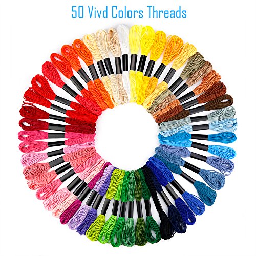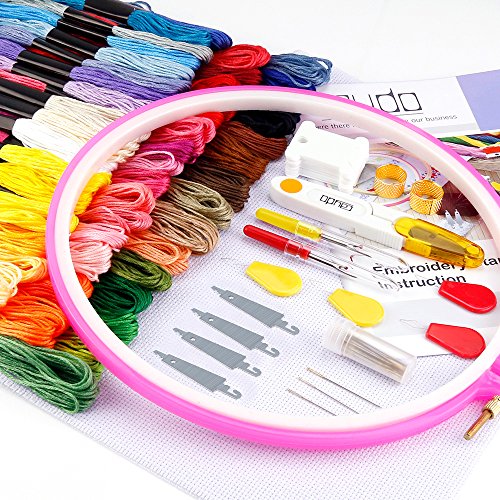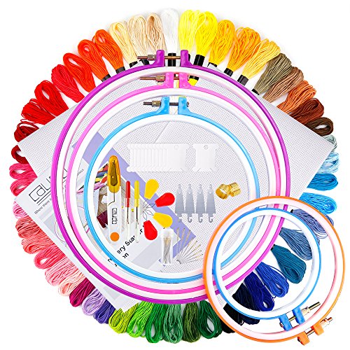 - Package Content: 5pcs plastic embroidery hoop, 50 color threads, 2pcs 14 count white cotton classic reserve Aida, 30pcs 3 sizes embroidery needles, 12pcs floss bobbins, 8pcs cross stitch needle-threading tools, 2pcs thimble, 2pcs untwist tool, 1 pair of scissors, 1pcs instructions