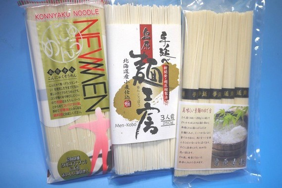 左から順番に、≪こんにゃく素麺≫≪麺工房(手延べ干しめん・細うどん)≫≪島原手延べそうめん≫