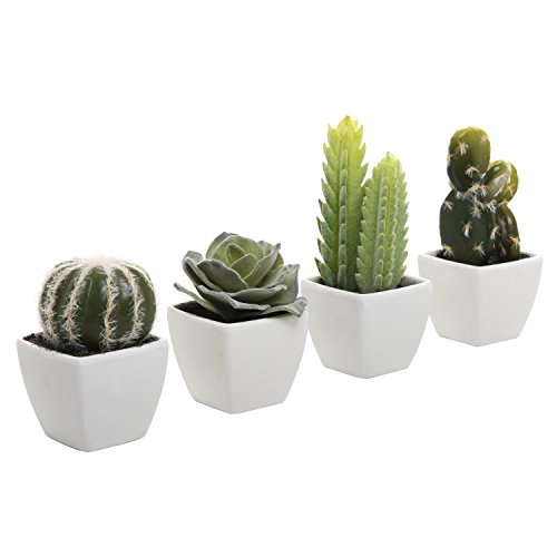 Set of 4 Artificial Mini Succulent & Cactus Plants in White Cube-Shaped Ceramic Pots, by MyGift