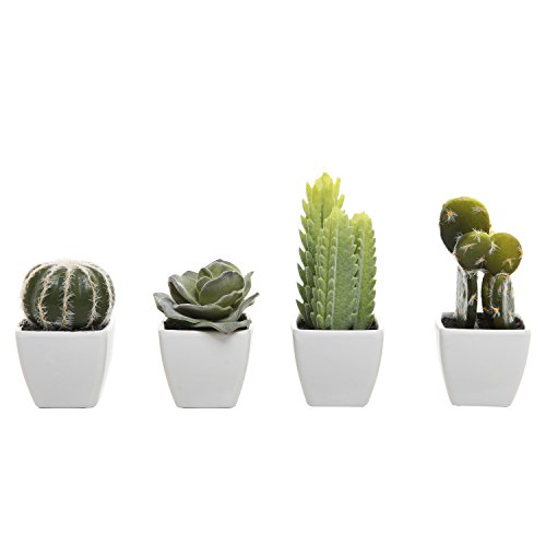 A set of 4 artificial succulent and cactus plants housed in white ceramic pots.