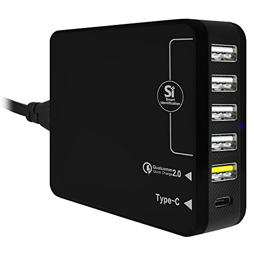 -. Feature : Multifunctional - Features 4 x universal USB ports (USB 2.0/3.0 Supported), 1 x Qualcomm quick charge 2.0 port and 1 x USB Type C port. Perfect for charging up to 6 tablets, Smart phones or other USB devices at full speed simultaneously. / Power packed - powered by most Advance charging technology, Qualcomm quick charge 2.0 allows compatible devices to charge up to 75% faster. / Next generation ready - the amazing Type-C port offers charging and data transfer at a rapid speed. / Intelligent - Smart identification detects and identifies your Device to deliver the most effective charge speed possible. Power Safety Protection, no more over charge / Universal - includes international wall plugs for charging in US, Europe and UK. International Voltage Support from 100 to 240V 50/60Hz.