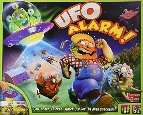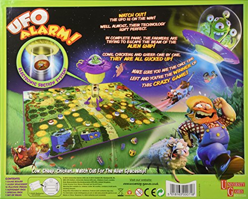 Studio : University Games Publisher : University Games Binding : Toy Product Description UFO Alarm is a fast paced and exhilarating game for children. Players face a head on Battle with a selection of evil aliens! Dare to leave the farm and face an alien attack? Be careful, throw a wrong roll on the dice and you could find yourself paralyzed with fear, teleported by the electronic spaceship and abducted by aliens! Be sure to look out for secret passages and trap doors! Box Contains x1 Game Board x1 Alien Spaceship x16 Playing Pieces x1 Movement Dice x1 Special Dice x1 Set of Rules 0