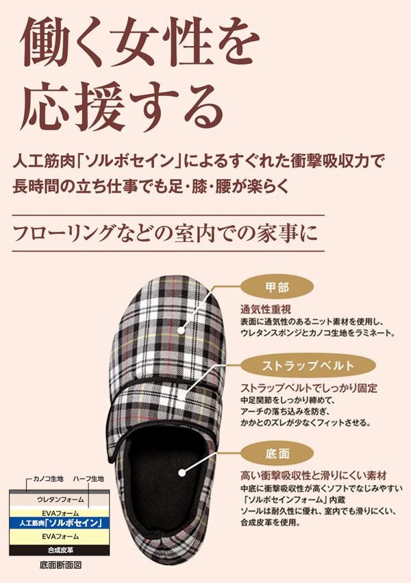 | 医療分野で使用されている人工筋肉「ソルボセイン」による優れた衝撃吸収力で足・膝・腰のトラブルを軽減します。フローリングなどの室内での家事に。 |