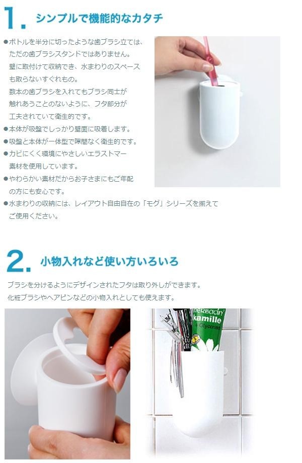 | 吸盤で壁に取り付けるので、歯ブラシをスッキリ収納できます。吸盤と本体が一体型なので隙間がなく衛生的。カビにくく環境にやさしいエラストマー素材を使用しています。フタを外せば小物入れとしても使用可能です!! |