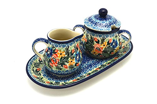 Studio : Ceramika Artystyczna Publisher : Ceramika Artystyczna Product Description 4 1/2"H x 5 1/4"W x 9"L Handmade and hand-painted in Poland This handsome 4-piece set will brighten your tea time any time of day! Includes: sugar bowl with lid, 4 oz. cream pitcher, and serving platter. Unikat Signature - signed by the artist - Maria Starzyk cream and sugar , tea and coffee , serving sets , teapots , polish pottery , CA Pottery , Ceramika Artystyczna , Polish Stoneware 0