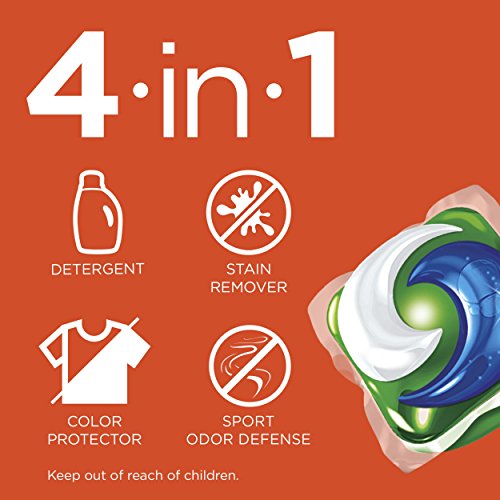 -. Feature : Tide PODS Plus Febreze Sport Odor Defense fights tough set-in odors + stains in 1 wash / Each Tide PODS is a 4-in-1 breakthrough technology with detergent, stain remover, color protector, and Odor Defense technology, giving you more bang for your buck / Tide PODS pacs are small but powerful. They pack 6X cleaning power* in half the time (*Stain removal of 1 Tide PODS pac in Quick cycle vs 6 doses of the next leading liquid HE-compatible detergent in Normal cycle) / The multi-chamber pac's breakthrough technology dissolves in both hot & cold water / Tide PODS are formulated with quick collapsing Smart SudsTM, while still targeting tough stains and works in both HE and standard washing machines / Use 1 pac for small/medium loads, 2 pacs for large loads, or 3 pacs for extra-large loads / Keep out of reach of children