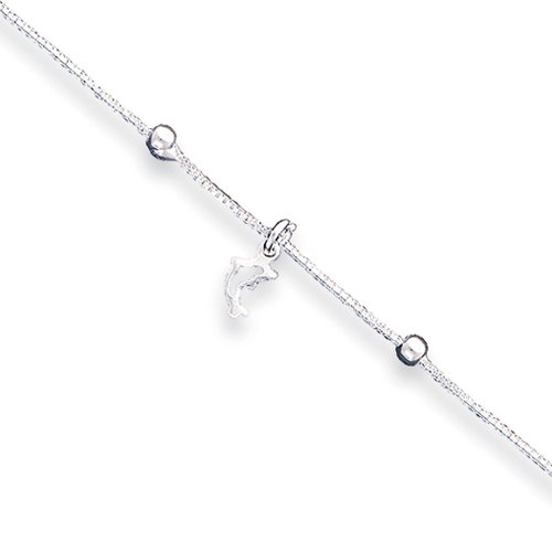 Treat yourself or a loved one to a beautiful sterling silver dolphin anklet that brings to mind the wonders of the sea. This one features a tiny 6mm dolphin silhouette charm dangling from 1mm width box chain accented with two 3mm polished bead. It closes with lobster claw clasp and is adjustable in length from 8 to 9 inches. Made in ItalyFeature