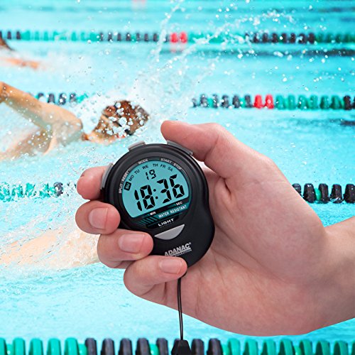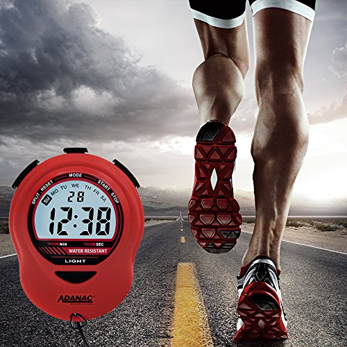 -. Feature : Jumbo display and large grip buttons / Displays minutes, seconds and 1/100th seconds / Times single and split events / Displays hour, minute, seconds, month, date and day / Includes detachable 46" black lanyard (neckband)