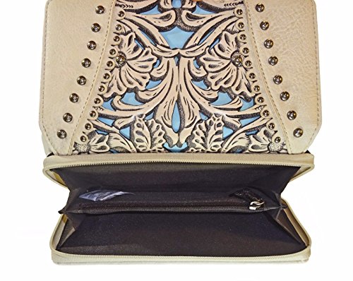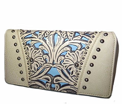 Studio : Western Fashion Publisher : Western Fashion Binding : Apparel Product Description New Trinity Ranch® Floral Tooled, Secretary Style Organizer Wallet- Beige Product Code: TR38-W010 Bag Details: Length: 7.5 - Height: 4.5 Depth: 1 * Genuine vintage tooled leather with matching color inlay * Embellished with antique silver studs and leather saddle stitch details * Pu Leather Trim Backing (PU leather: leather particles coated in Polyurethane or a thin layer of leather coated in Polyurethane) ? Zip Around Closure for 2 Compartments plus Zipper Pocket ? Snap Closure for Trifold Area that features: 2 ID Slots, 10 Card Slots, and 2 Bill Pockets 0