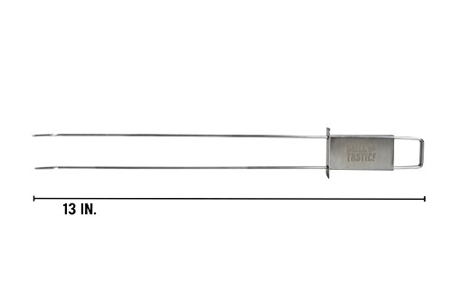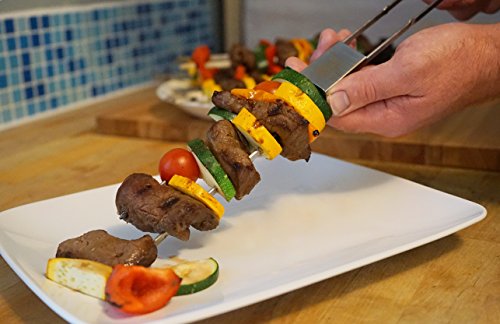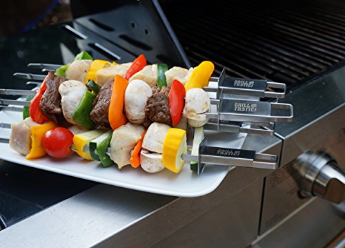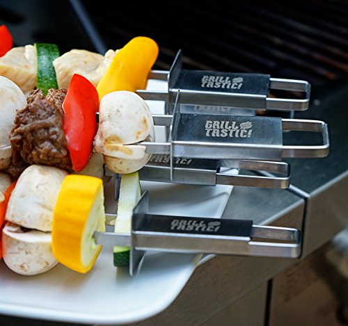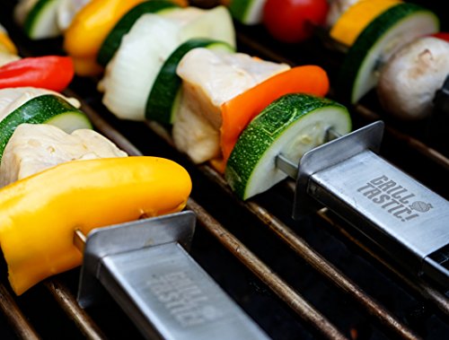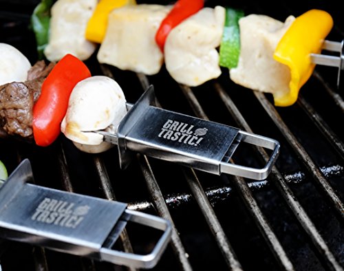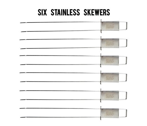 Product Description Our Products Aren't Just Great, They're Grilltastic! Perfect For A Backyard BBQ Hands down, these are premium skewers for the serious griller and any beginner. The long 13" skewer leaves plenty of room for your meats and vegetables. Our set of 6 skewers is enough for alot of cooking at one time. Others only offer 3 or 4, THAT'S NOT ENOUGH! Quick Release GripWhy risk cutting yourself with the knife or fork trying to slide the meat and veggies off the skewer? With the easy slider grip, just push the food down the skewer. Indentions at the end of the skewer prevent the grip from sliding off, which also benefits you when you throw them in the dishwasher. Makes the Perfect Gift Our professional and secure packaging makes the Grilltastic skewers the perfect gift. You get 6 premium stainless steel skewers. Instead of the bamboo skewers that like to break while handling, you don't have to worry about that happening with our stainless skewers. HEAT WARNING! We want to make sure you are safe when using the skewers. ALWAYS use a heat glove or rag to prevent you from burning yourself. DO NOT grab the skewers directly off the grill with bare hands. Also, the ends of the skewers are sharp, so please use caution when handling them. 0
