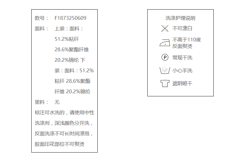 上装:面料:51.2%粘纤 28.6%聚酯纤维 20.2%锦纶 下装:面料:51.2%粘纤 28.6%聚酯纤维 20.2%锦纶