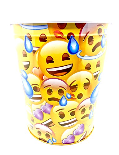 Product DescriptionEmoji Child's Wastebasket, Tin, Coral background with Colorful Emoji's, Palm Tree, Eyes, Victory Sign, Pointing Finger, House, Envelope with Purple Heart.0