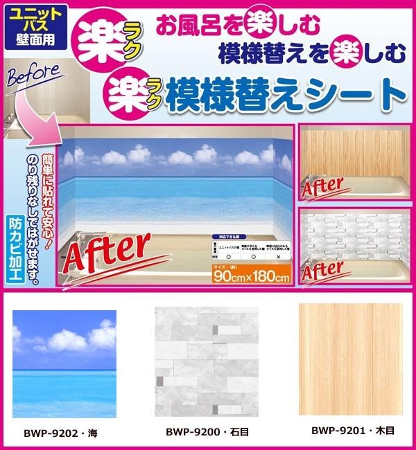 糊なしで貼ることができるユニットバス用の壁紙です。簡単に貼れて、キレイにはがせます。 お風呂 壁紙 風呂 浴室 壁 シート お風呂に貼るシートサイズ 92×180cm  個装サイズ:6×6×98cm重量 個装重量:850g素材・材質 表面:塩化ビニル100%中間層:アクリル樹脂100%裏面:ポリプロピレン製造国 日本商品名 ユニットバス壁面用 楽楽模様替えシート 92×180cm ※サプライヤー直送品