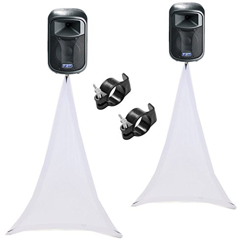 The single triangular shape covers one side of a tripod speaker stand and offers a stretch factor height of 4 to 7' with a bottom foot stretch of 3.5 to 4.5'. The lightweight polyester-blended spandex-like material is flame retardant and ships with an included zippered tote bag for ease in transport.