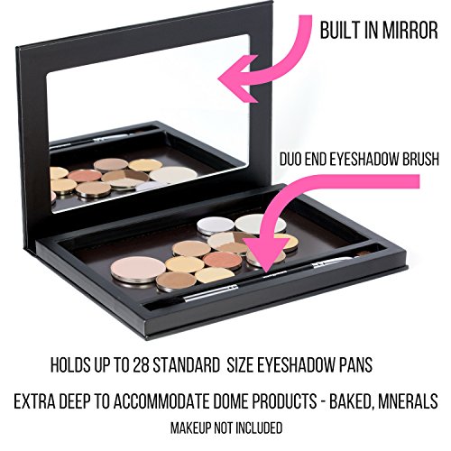- THIS MAGNETIC PALETTE HAS IT ALL! Holds 28 standard eyeshadow sized pans, but accommodates different pan sizes and shapes. Extra deep to accommodate dome shaped products such as baked and minerals. Includes high quality built in mirror in the lid, 10 magnetic stickers for aluminum pans , PLUS get a dual ended eyeshadow brush that fits into a built in makeup brush space.