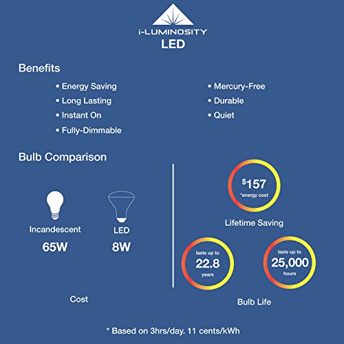 💡✔ SWITCH AND SAVE - LED BR30 Equivalent of 65W bulb - LED light bulb only uses 8W! Estimated energy cost is $0.96 per year, saving up to $157. Lifetime average is 25,000 Hours and lasts up to 22.8 years! Better for the environment and your budget. Energy Star certified.