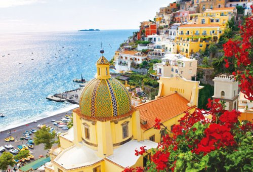 The Tyrrhenian Sea spreads beyond the cliff where colorful buildings line up.