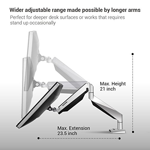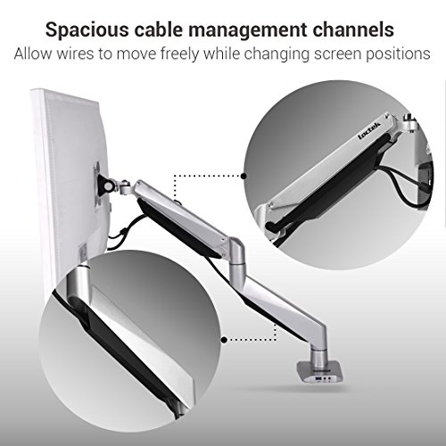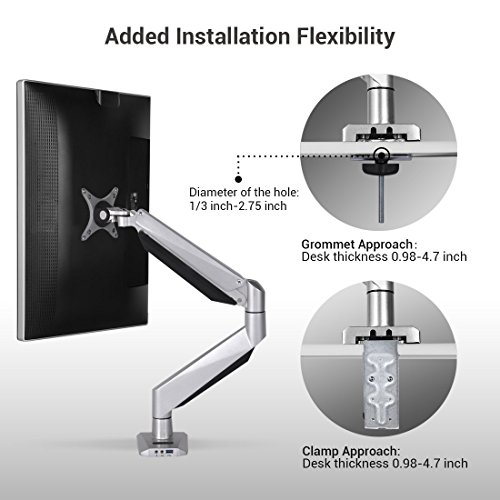 This premium single arm computer monitor mount offers an attractive way to display one monitor while saving the most amount of desk space. The Arm easily adjust , allowing you to work in a more comfortable, ergonomically correct position. Staring at a computer screen that's not eye level can cause neck and eye strain, as well as painful back problems. Our patented, high performance monitor mount offers a wide range of features that our competitors don't offer. You will notice the difference right away. Quality craftsmanship, impressive functionality and unparalleled design raise the bar for this mount to the highest level.