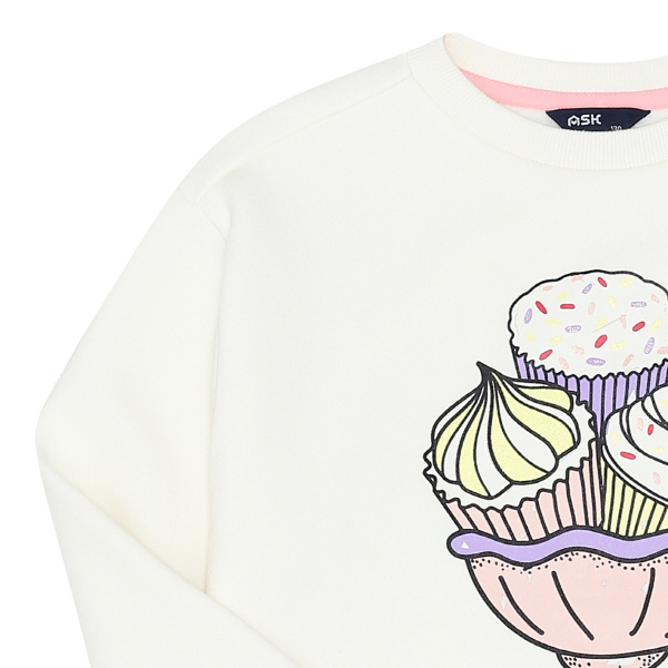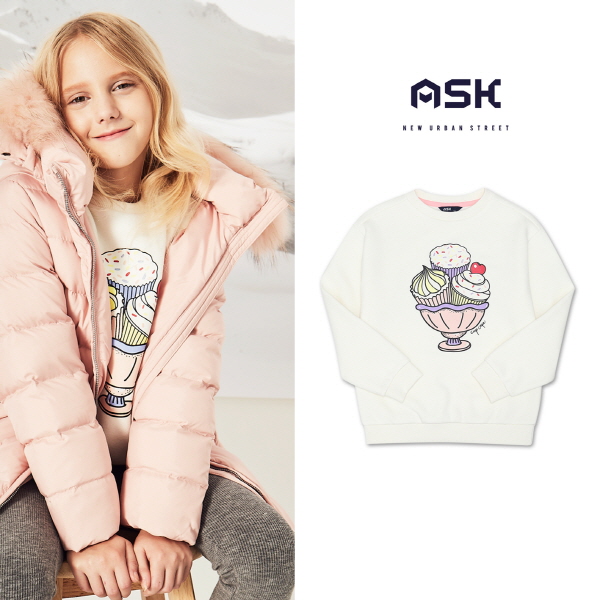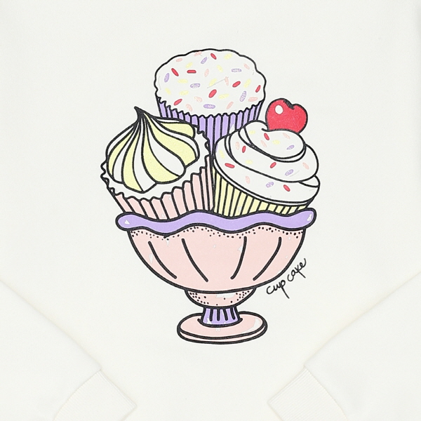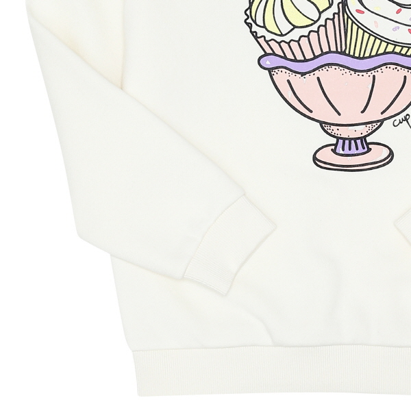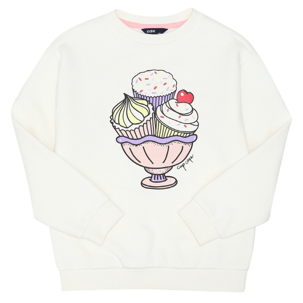 CVC 기모쮸리 소재의 오버핏 맨투맨. 컵케이크 아트웍으로 포인트를 준 스타일. 귀여운 스타일로 여아들에게 판매하기 좋음.