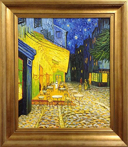 Van Gogh Cafe Terrace at Night FRAMED Original Oil Painting Art Hand painted original and framed oil painting made to look exactly like the original classic Hand stretched and framed so it's ready to hang. What you see in the pictures is what you get. See pictures below. Frame is made of nice wooden material and it is 2" thick, so it sits 2" away from the wall and it doesn't look cheap like those flat 1/2" frames. The frame alone at any frame shop is $250. Framed size tip to tip is 30 1/2 x 26 1/2 x 2 inches. Painting size is 20x24 inches Weighs 15 lbs Wire for hanging and a picture hook are included, see example picture below. Painting will be packaged in bubble wrap very well and then put in a heavy duty box. See sample picture below.Feature
