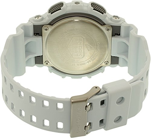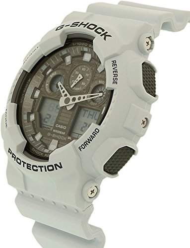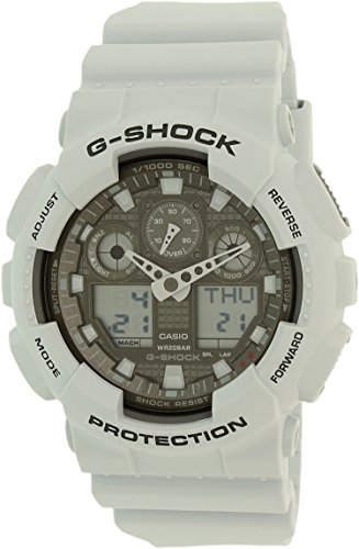 Brand, Seller, or Collection Name:Casio Model number:GA-100LG-8ACR Part Number:GA-100LG-8ACR Model Year:2014 Item Shape:Round Dial window material type:Mineral Display Type:Analog and digital Clasp:Buckle Case material:Resin Case diameter:46 millimeters Case Thickness:13 millimeters Band Material:Resin Band length:Men's Standard Band width:0.75 inches Band Color:White Dial color:Grey Bezel material:Fixed Calendar:Day, date, and month Special features:LIMITED EDITION Item weight:2.40 Ounces Movement:Quartz Water resistant depth:200 Meters
