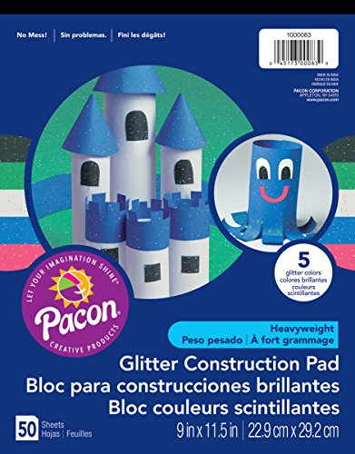 Pacon Glitter Construction Paper Pad, 5 Assorted Colors, 9" x 11-1/2", 50 Sheets