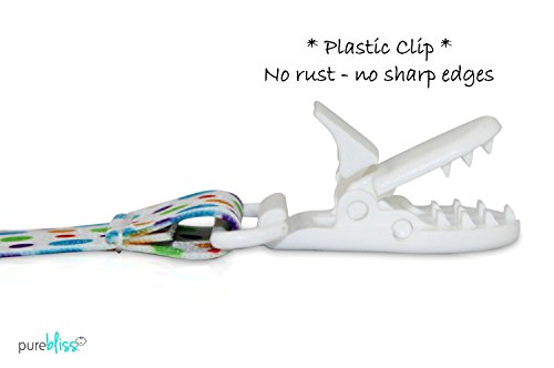 - Feature : Plastic clip won't rust and has no sharp edges - so no owies and no holes in clothing. / Unisex design works great for boys and girls and also makes a cute baby shower gift. Any pacifier or item with a small hole or handle fits with our loop design. / Our pacifier leash can also be used to secure teething toys, small security blankets, stuffed animals etc. It can be attached to baby's clothes, your stroller or car seat. / Washable & Durable - Our pacifier leash is made with a double sided satin ribbon so there is no stitching to unravel. Plastic clips contain No BPA and No Phthalates. / Your Satisfaction is Our Guarantee - At Pure Bliss we take our customer satisfaction seriously! If there is anything we can do to make your experience or our products better please don't hesitate to ask. If you are unhappy for any reason, return it for a full refund.