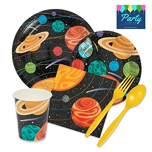 -. Feature : This Space Party Supply pack includes the following disposable party supplies for 16 guests: / (16) 9" round dinner plates, (16) 7" round dessert plates / (16) lunch napkins, (16) 9oz paper cups / (32 piece) yellow plastic cutlery set - (16) forks, (16) spoons / You'll also receive a unique Party Tableware Today Party Planning Checklist PDF to help get your party organized so you can enjoy the party too!