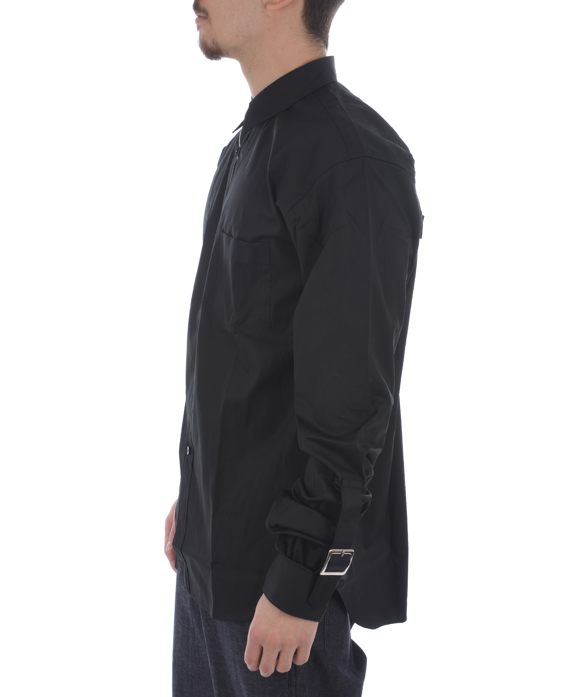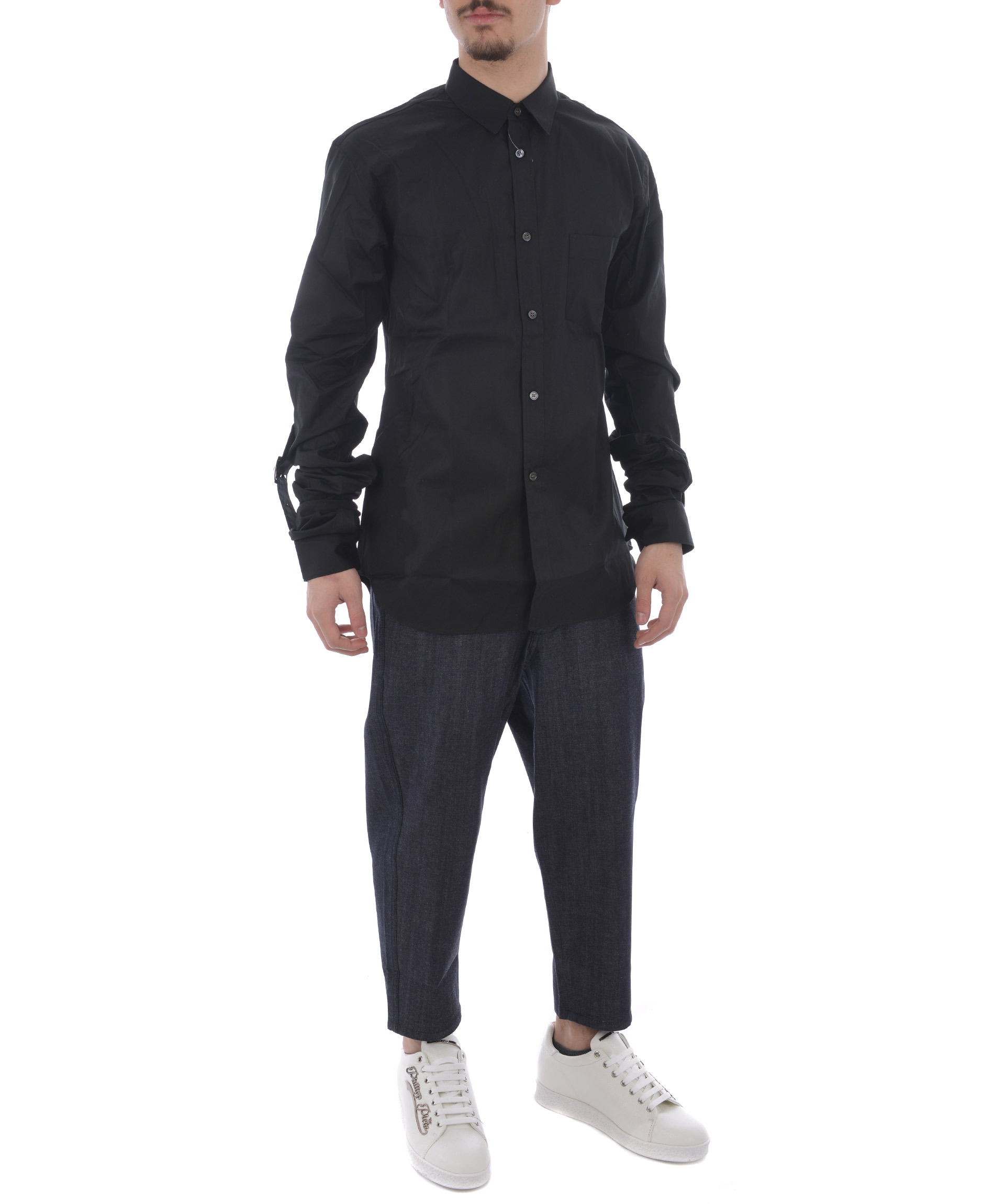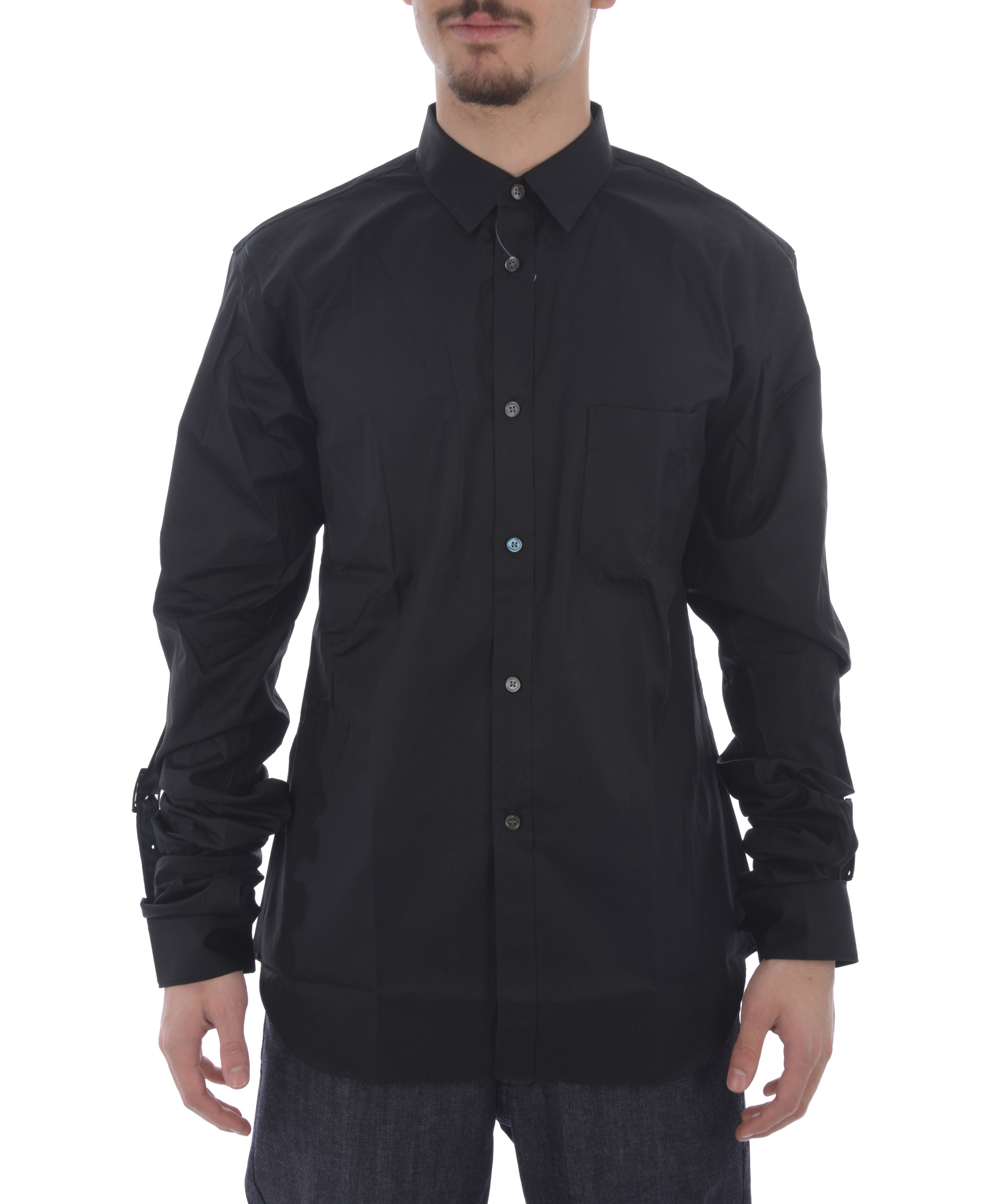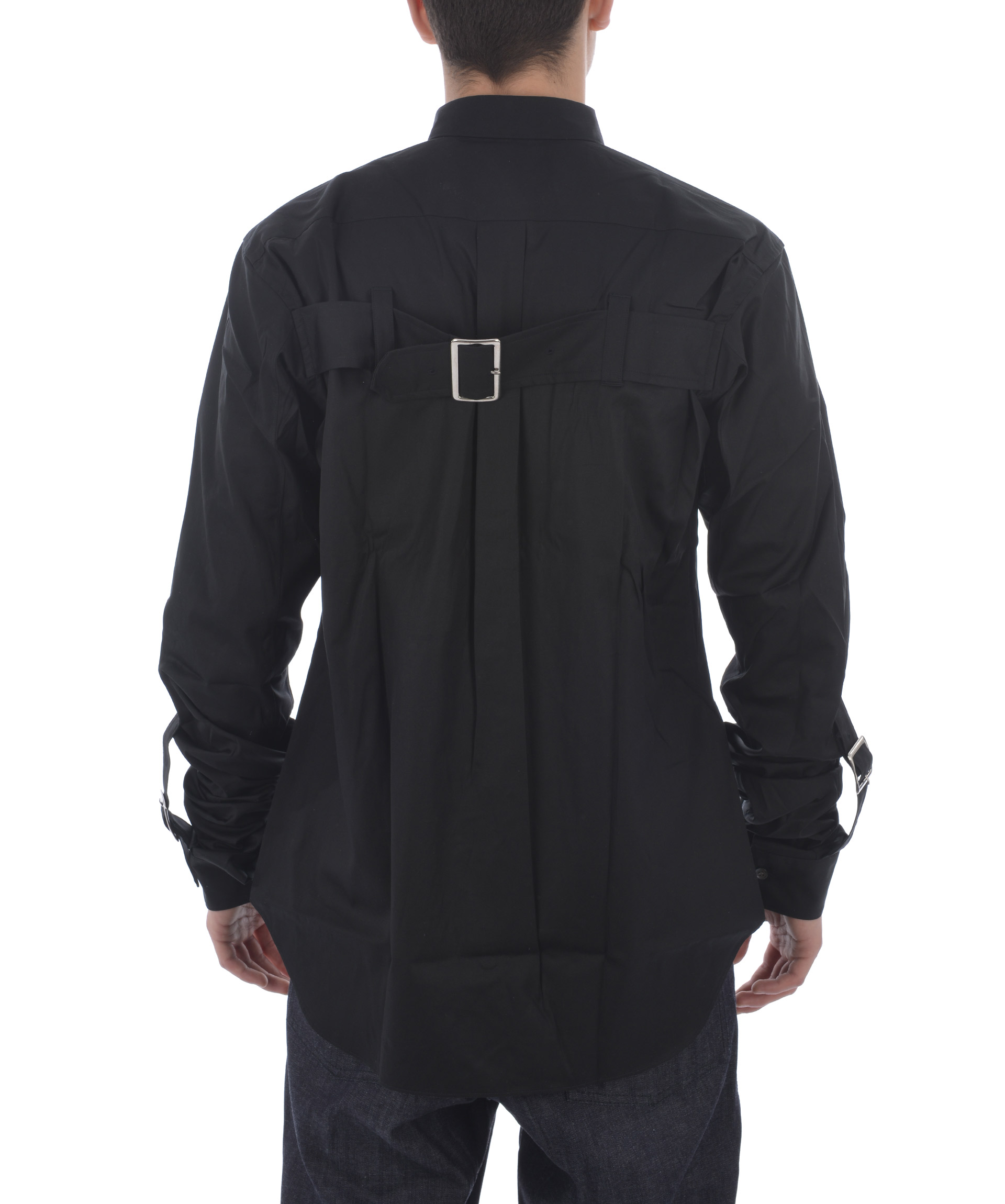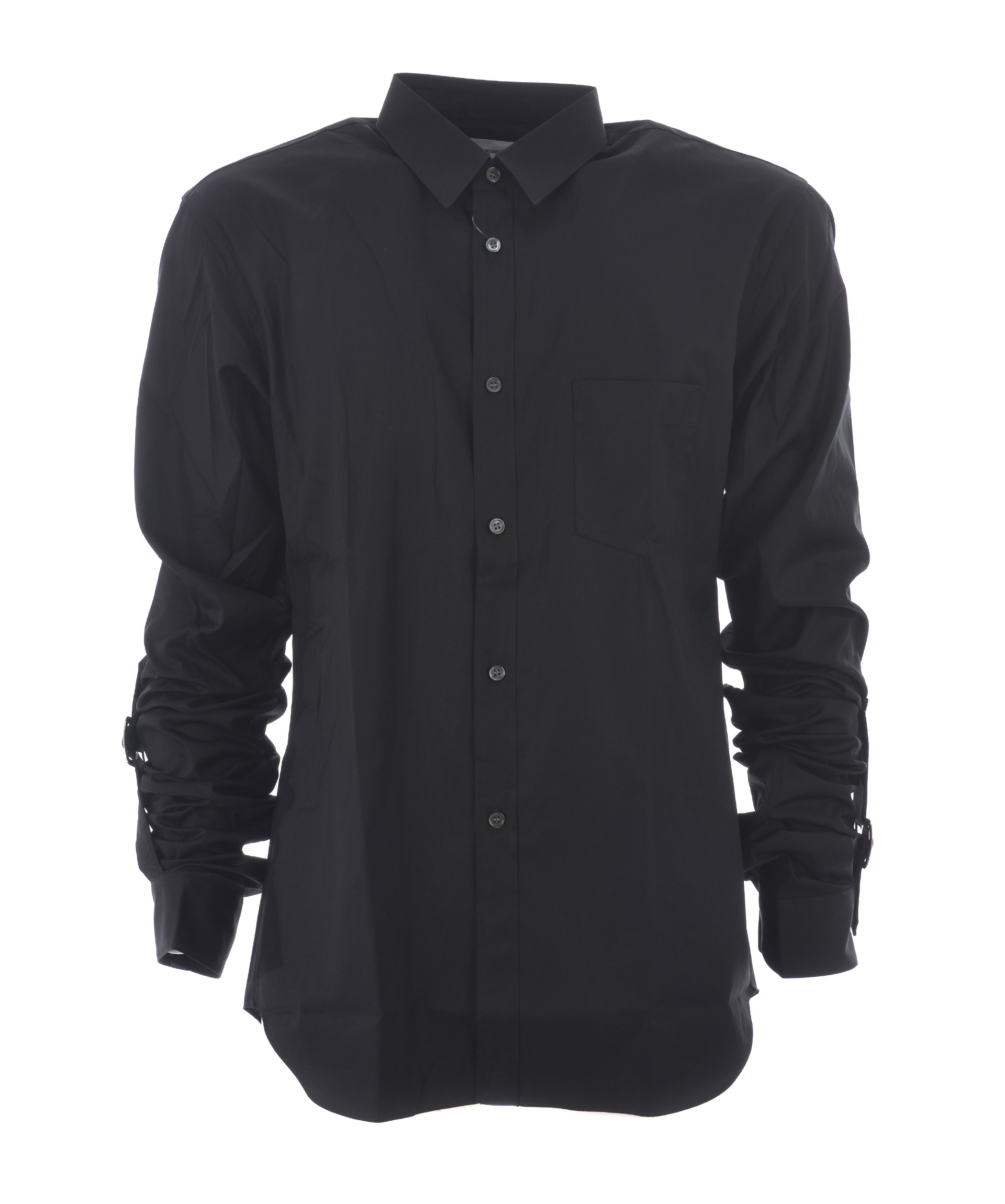 Strapped Cuffs Shirt from Comme Des Garçons Shirt: Black Strapped Cuffs Shirt with classic collar, long sleeves, front button closure and curved hem.