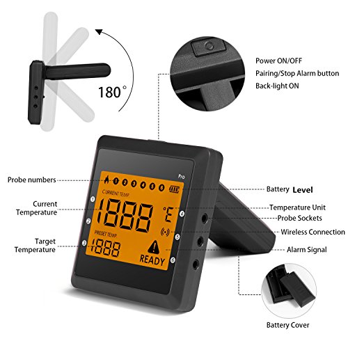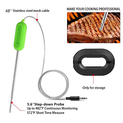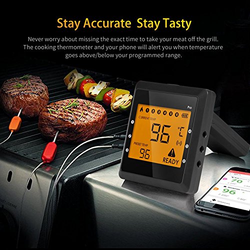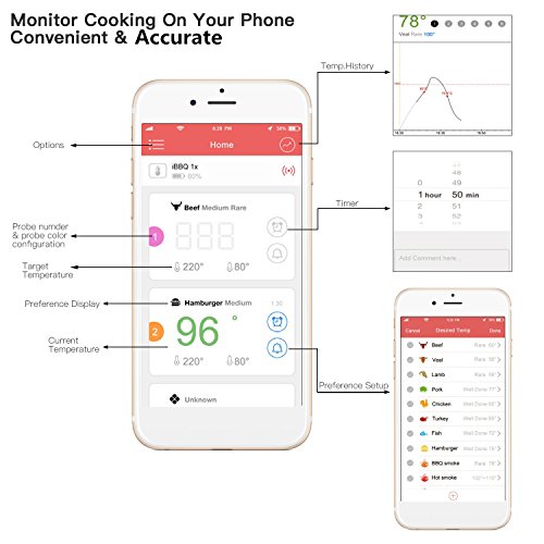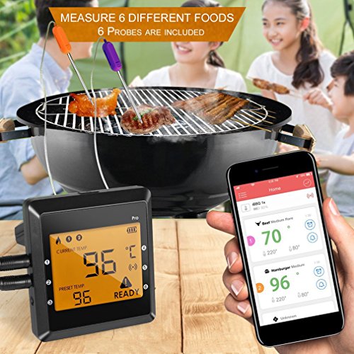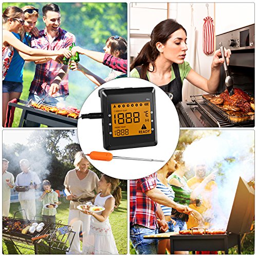 ?6 stainless-steel probes with steel mesh cables ?Large LCD Backlit display to easily determine meat temp and current settings ?Preset temperatures for various meats, includes Beef, Veal, Lamb, Chicken, Pork, Fish, Turkey, ?Hamburger,etc; Or Set Temperature Manually At Your Preference ?Cooking Levels: Rare/Medium/Medium Well/Well Done ?Programmed with timer/Temperature history graph