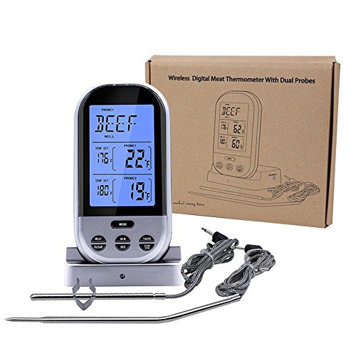 Enjoy Every Time of Cooking The GOGOGOFUN Digital Probe Oven Roasting Thermometer is designed to either give you a reading of your ovens current temperature or can be inserted into meats being cooked in the oven. Ideal for indoor or outdoor cooking or roasting. The temperature probe is designed to remain in the oven whilst the meat is cooking, removing the need and inconvenience of removing the roast from the oven to check the temperature. With the leave in probe, you no longer have to open the oven door, take out the roasting tray to check how well the meat is done. No more burnt hands! No more loss of heat! ?Features: Smart LCD Backlit Screen - The LCD is Blue when you begin to cook, Green when almost ready and Red when ready. Pre-Programmed For 9 Kinds of Meat: Ground Beef, Ground Poultry, Beef, Veal, Chicken, Pork, Poultry, Lamb and Fish. Wide Temperature Range and High Accuracy: Temperature range of probe: 15.8˚F to 482˚F (-9˚C to 250˚C), ±1.8°F/1°C accuracy. Probe Wire is Heat Resistant to 716°F(380°C). The 4" food grade stainless steel probe with step-down tip design to get temperature more precisely and quickly, 40" stainless steel wire / probe reaches any oven or grill. Press TASTE to select the level of?doneness for the meat type selected. RARE, MED RARE, MEDIUM, MED WELL and WELL DONE. Built in Count down and count up Timer. Powered by 2 AAA batteries. ? Notice: 1. Please read the instruction manual carefully before using. 2. Keep the stainless steel probe sensor and wire away from children. 3. Wash the metal probe tip with hot soapy water and dry thoroughly. Do not immerse the probe in water while cleaning. 4. Wipe the transmitter and receiver with damp cloth. Do not immerse either in water. 0 |
