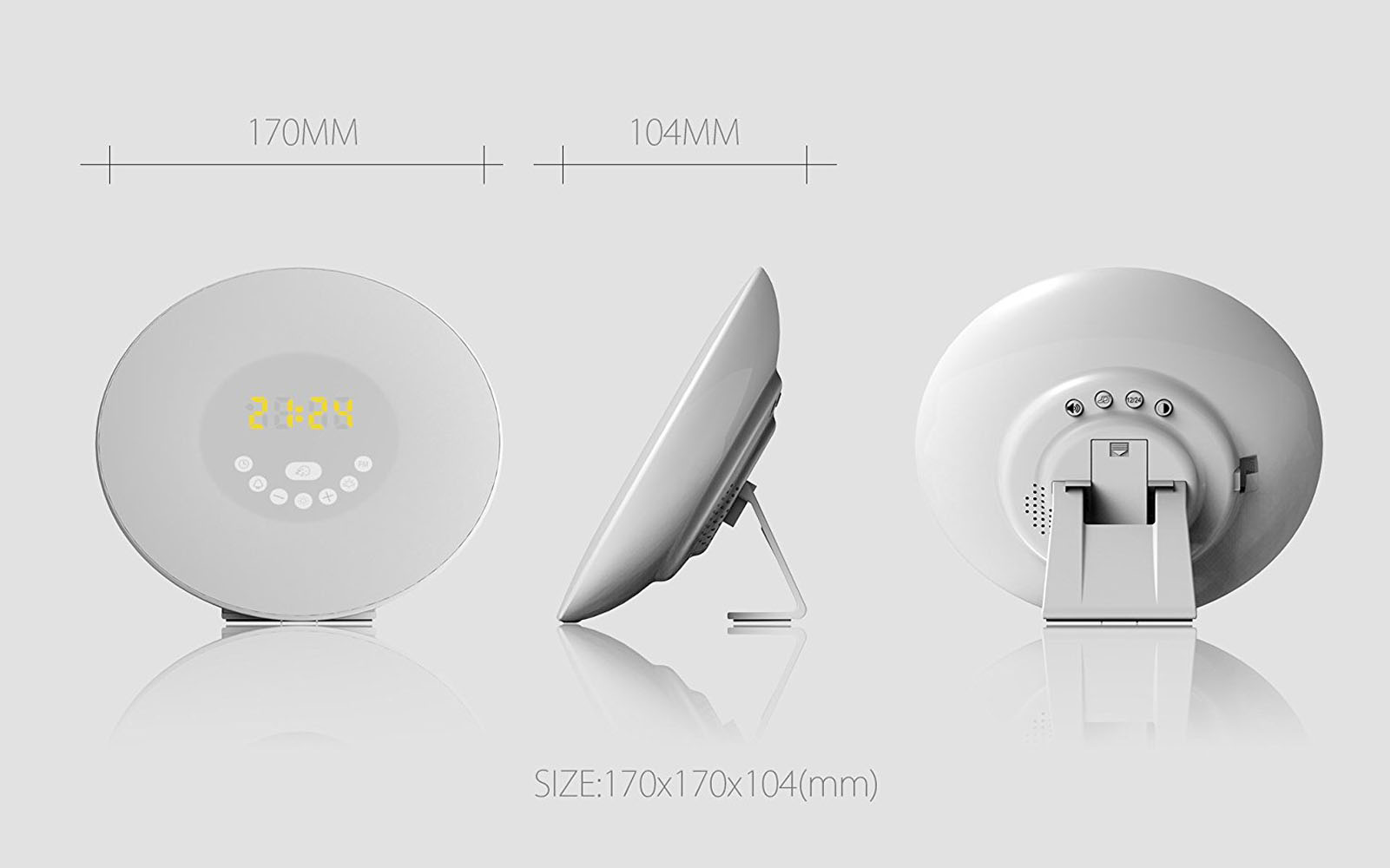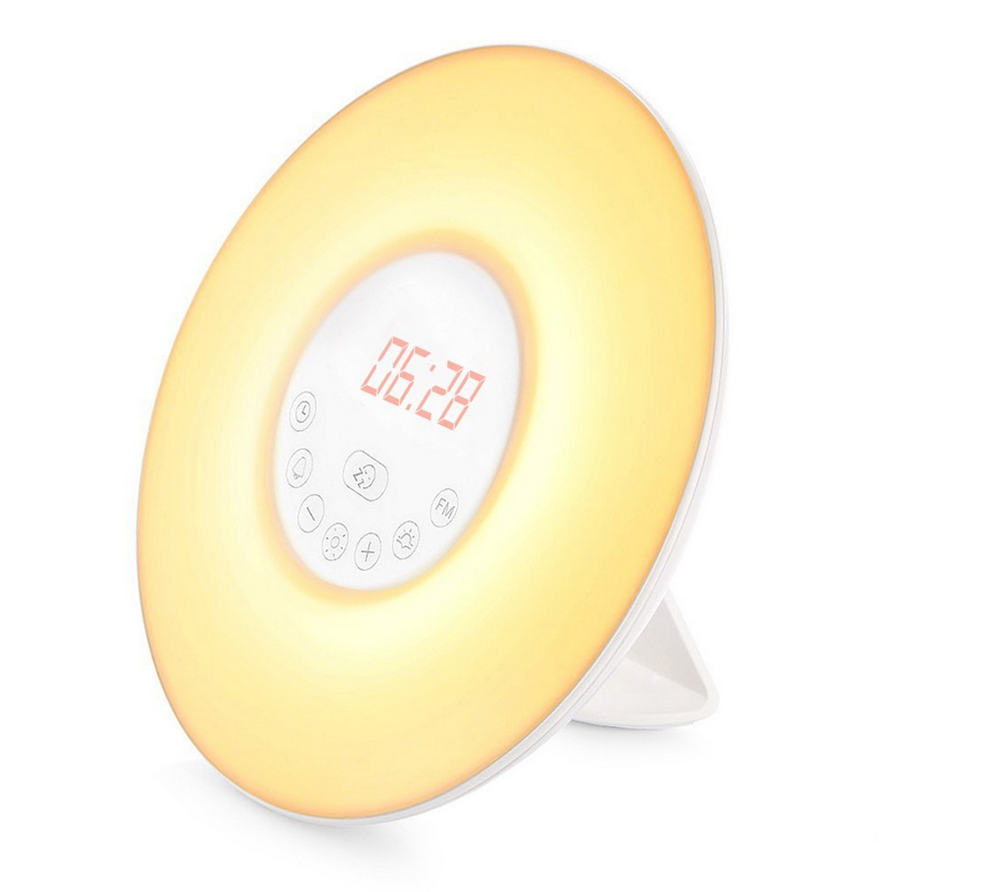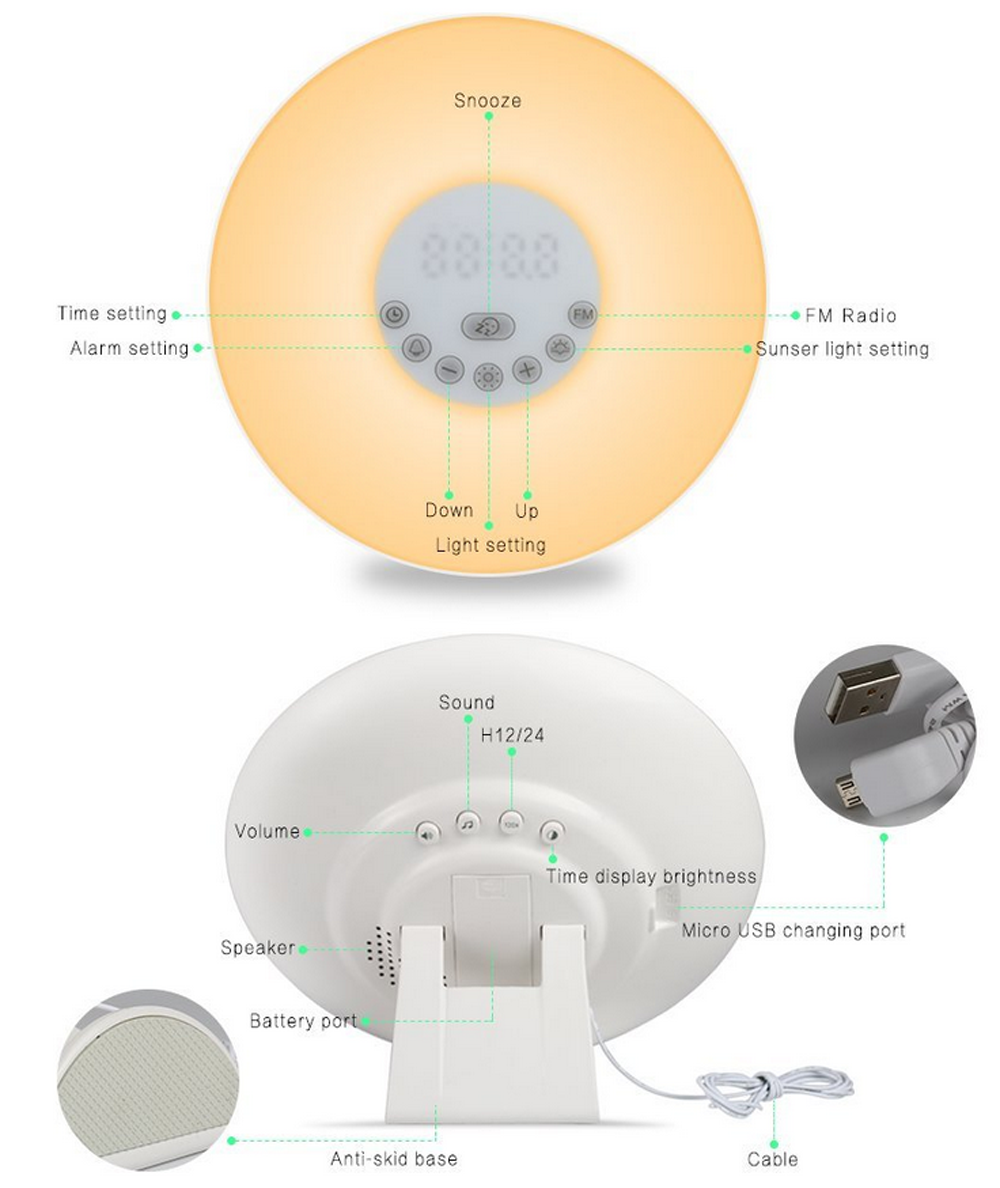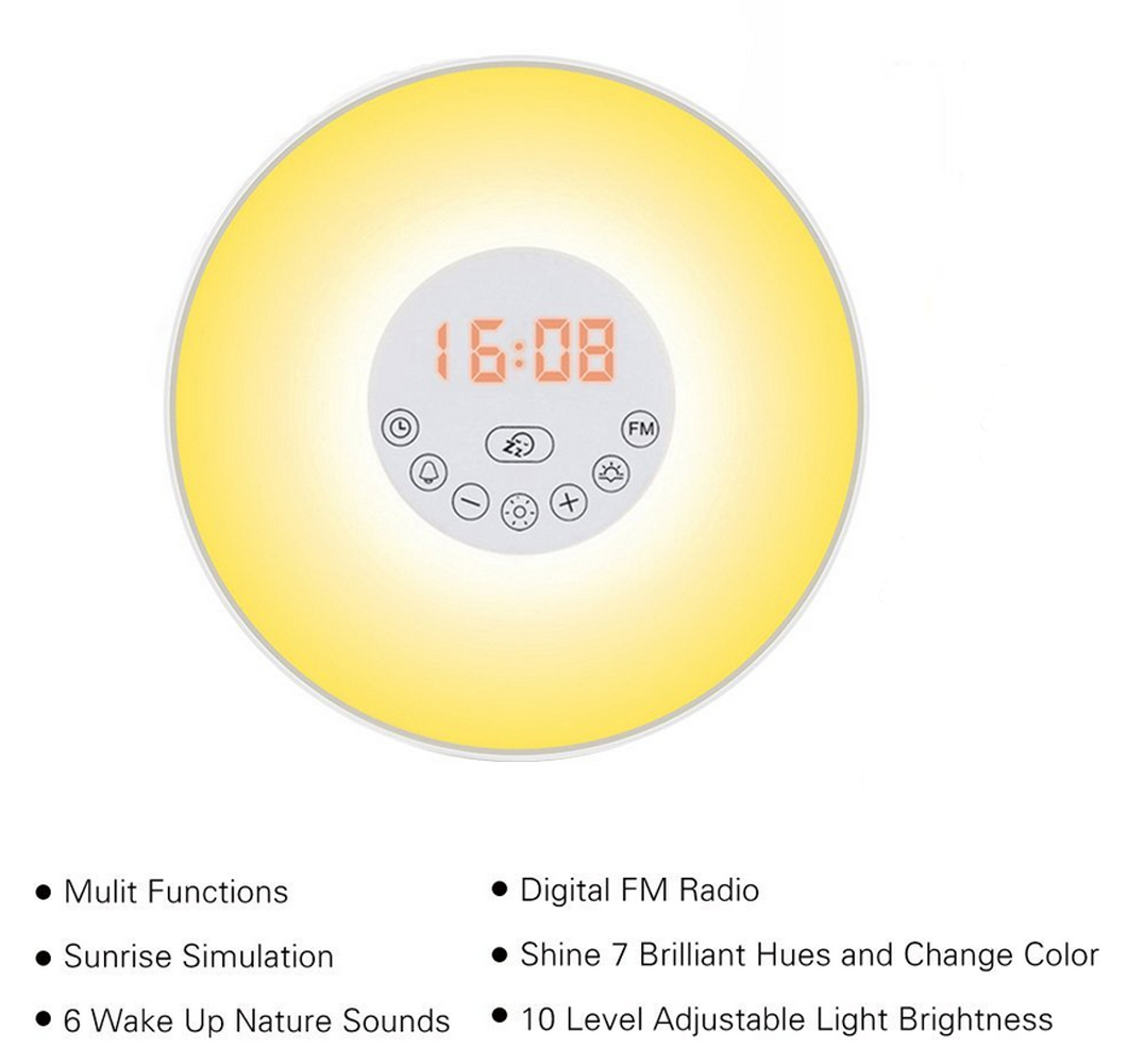 Sunrise Simulation Alarm Clock and Dusk Fading Night Light Sunrise simulation wake up light: 30 minutes before your alarm time, light gradually brighten from 10% of brightness to 100% and gently bring you out of a deep sleep, and feel energetic at the start of your day;