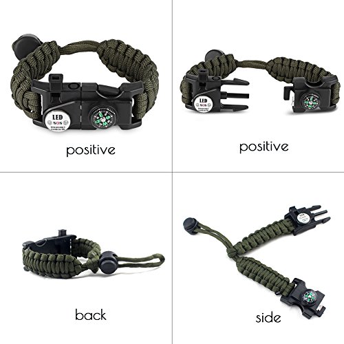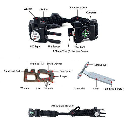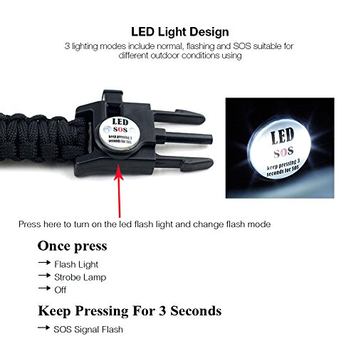 - MULTIFUNCTION - By carrying this you can frees spaces while travling. It ows embedded compass, sos led light, flint fire starter, emergency T-Shape Knife, emergency whistle, SIM Card Pin, Emergency Parachute Cord, Adjustable Fastener, etc. It also avaliable in the water.NOTE: take out the metal tool under the compass from the bracelet since it's removable, make sure the compass works.